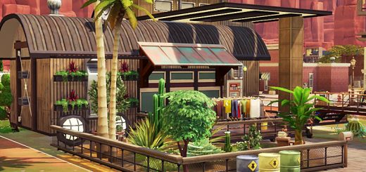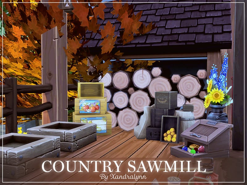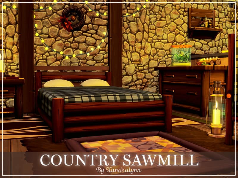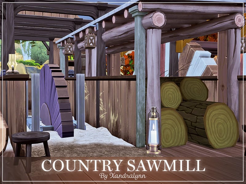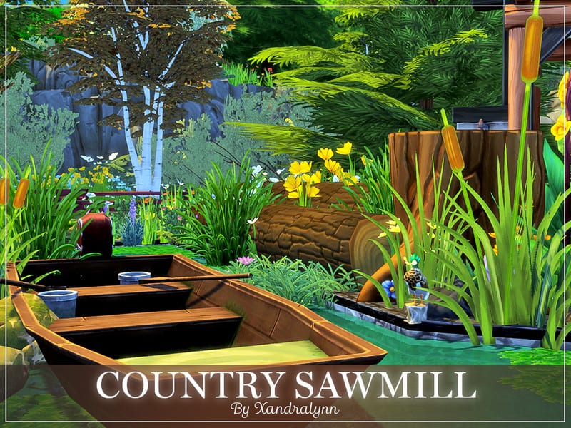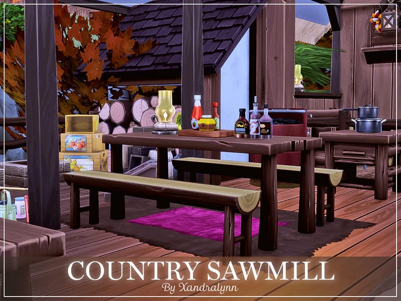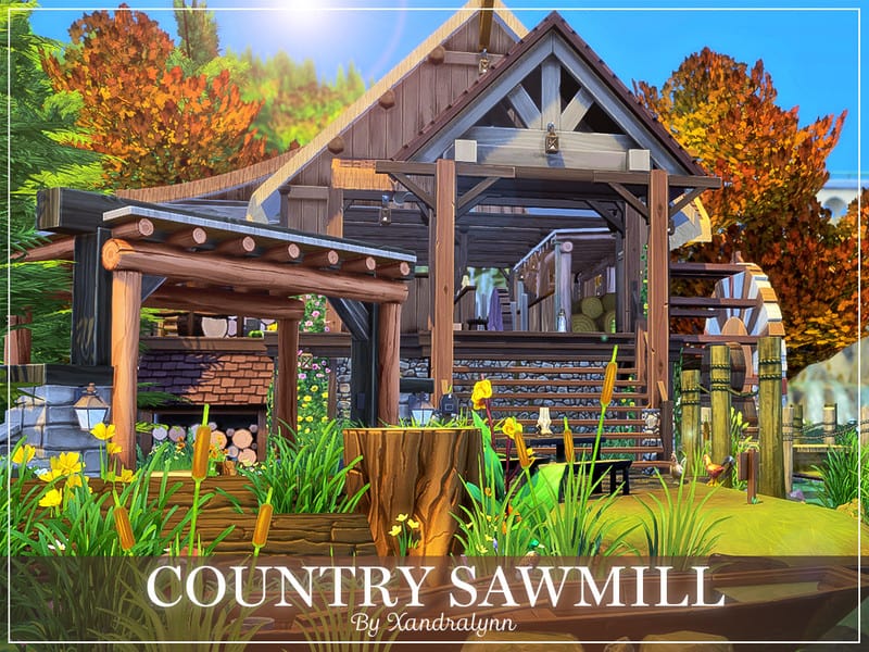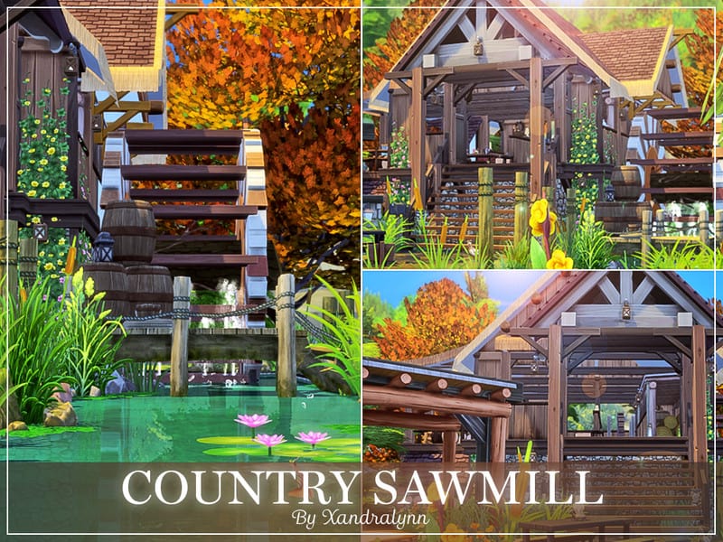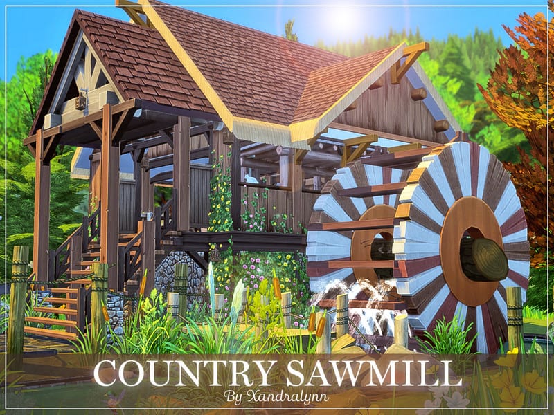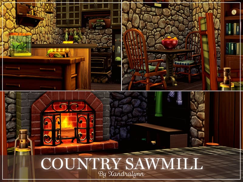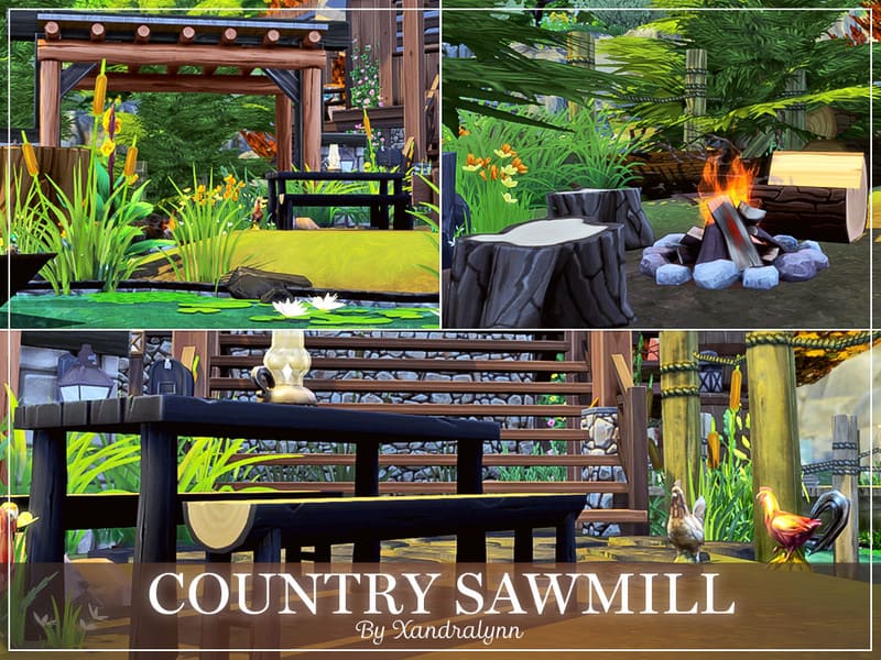 Country Sawmill is an old-fashioned lumber mill that is an ideal place of residence for any hardy sim seeking a life among nature. The upper floor of this lot contains a picnic table and barbeque, a small gardening space, pet supplies, and a woodworking table. The lower floor of the mill contains a living area with one sim bed, a pet bed, a kitchen, and a small bathroom. Outdoor activities include a campfire and a place to fish.