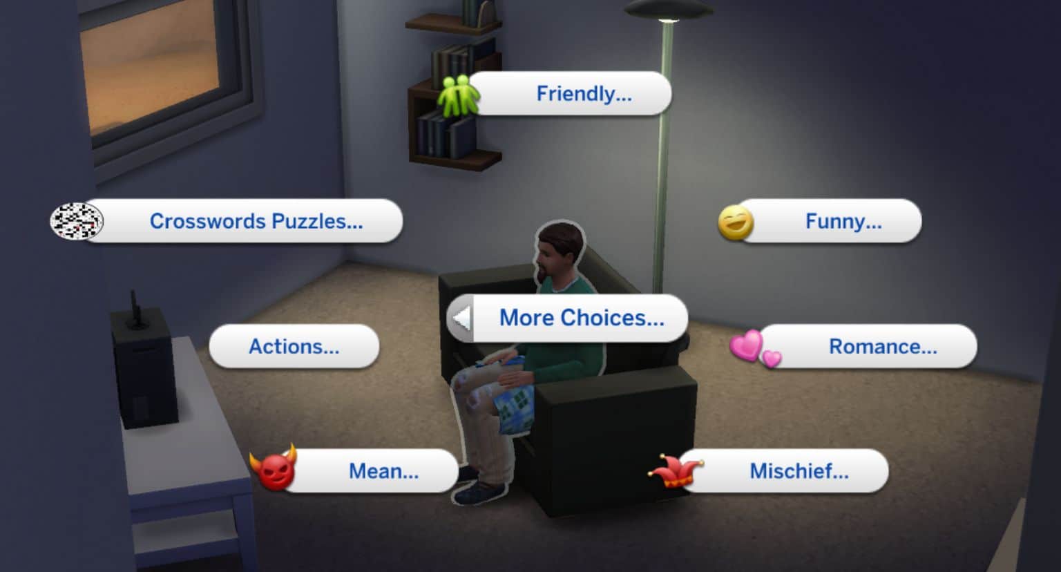 When SIm has this trait, the additional ‘Crossword’ pie menu is added during Sim to Sim interactions. They now can joke and get funny notifications.