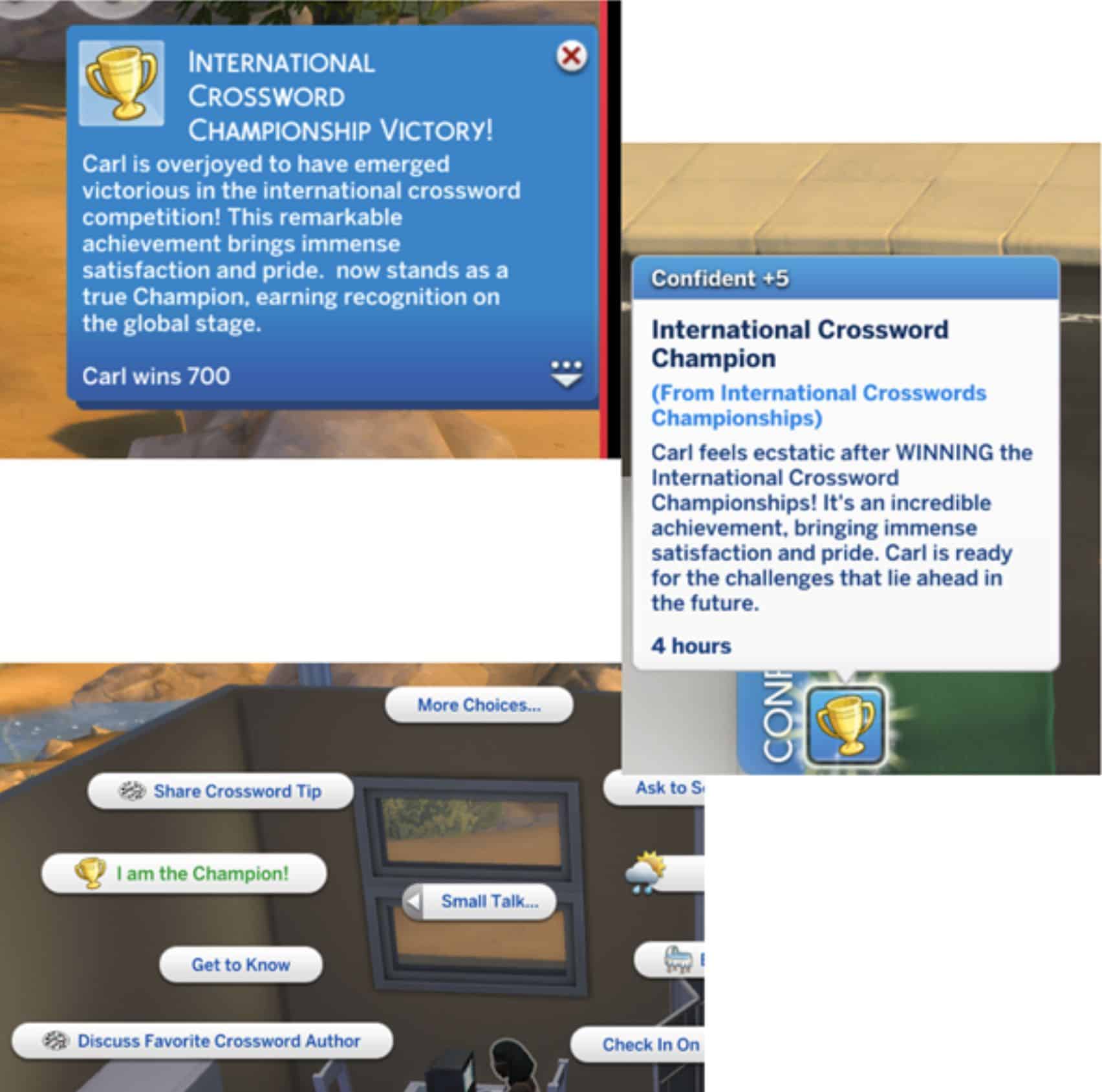 During competitions, Sims can lose, take second place, or win. It all depends on luck and the Sim’s skill. Depending on their placement, the Sim will receive a corresponding buff, notifiction and new interaction available only during the buff last (for winners only).