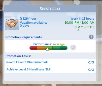 This is a part-time career! Your sims won’t ever work more than 20 hours per week, no matter which level or branch. Lots of time for other activities.