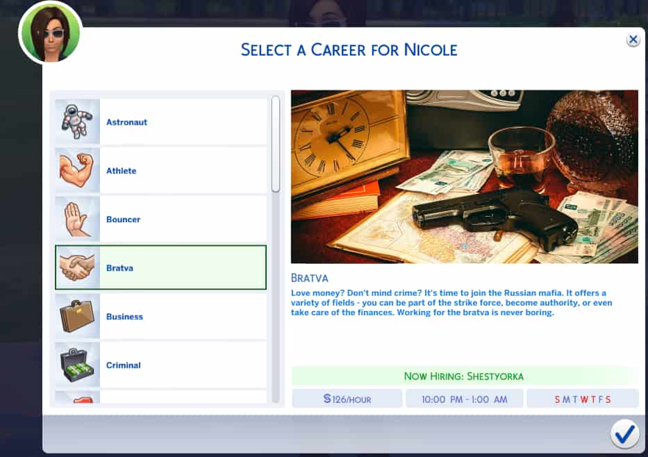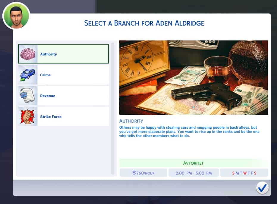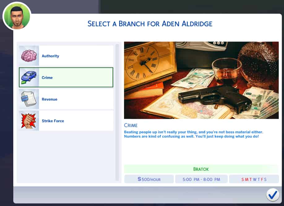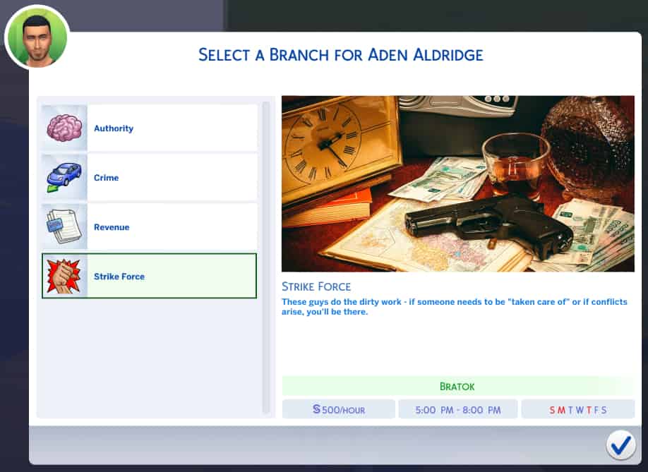 There is a common branch (Bratva) with two levels. Your Sim starts out as a low-tier member of the bratva and with some Charisma and Handiness can work their way up to the second level and afterwards choose one of the four branches. These branches also have two levels each.