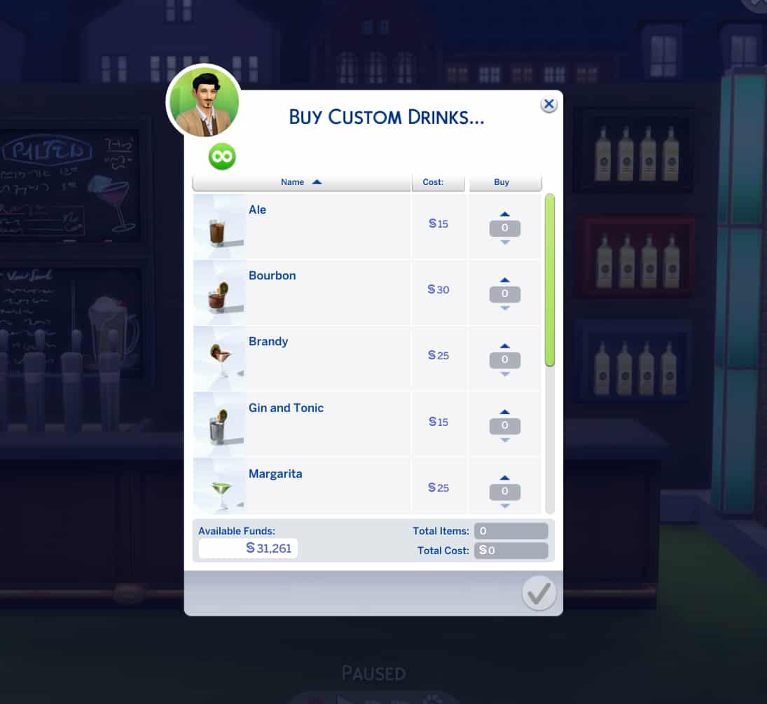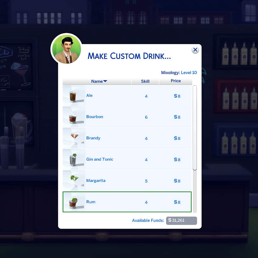 A: Each recipe requires certain mixology level. If your sim doesn’t have enough skill, some recipes won’t appear!