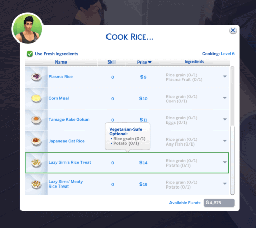 - Lazy Sim’s Treat (Optional Ingredients: Potato in Base Game and Rice Grain by Icemunmun)