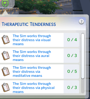 Music Therapy needs Get Famous to function properly, as it requires maxing the Singing skill and getting another instrument to level 8, then writing a song about the Sim’s experience. It also originally included playing said song, but I couldn’t get that to take.