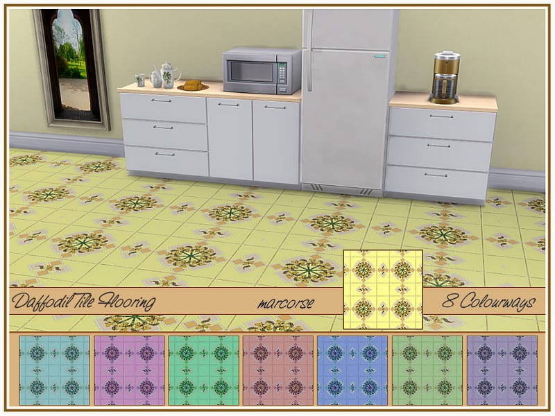 Multi-pane tile flooring with a central daffodil motif and small diamond shapes in toning shades. 8 colourways. Found in Tile. Cost : 2. Created in the base game for everyone.