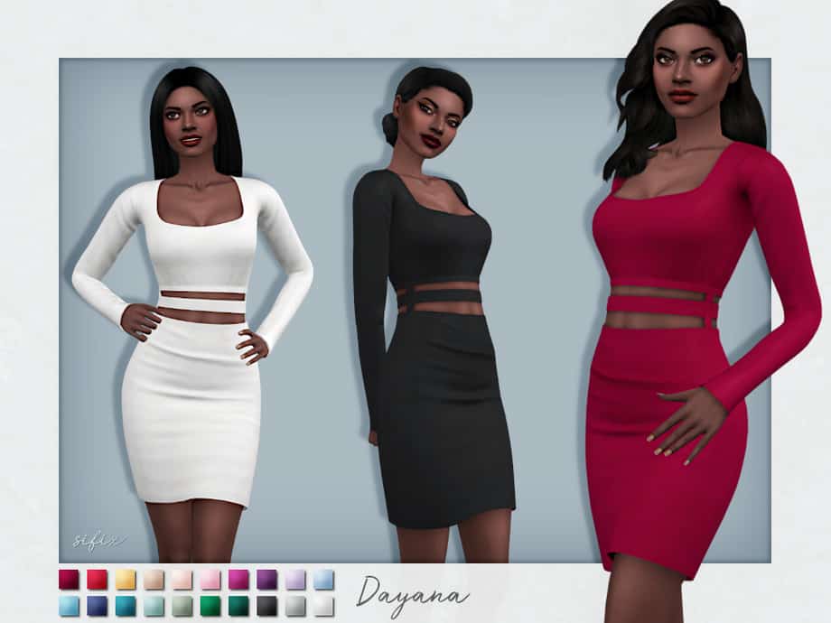 A short, tight-fitting, long-sleeved dress with cutouts, available in 20 colors for teen, young adult and adult sims.