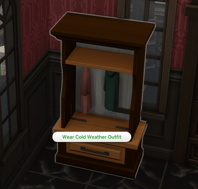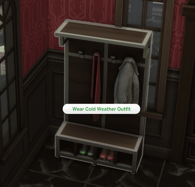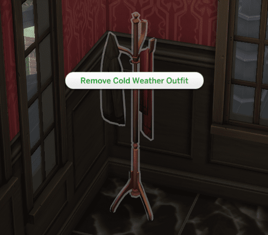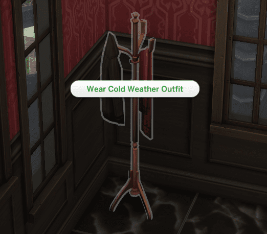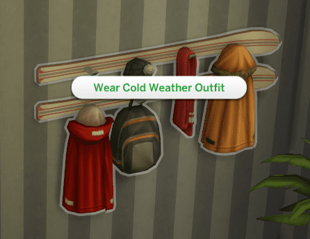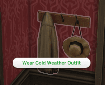 Not only does this give some objects a purpose, but it also lets you change your sim into and out of outerwear without going into a picker. Nothing fancy, just put on outerwear if you’re not wearing it and take it off (change into everyday) if you are.
