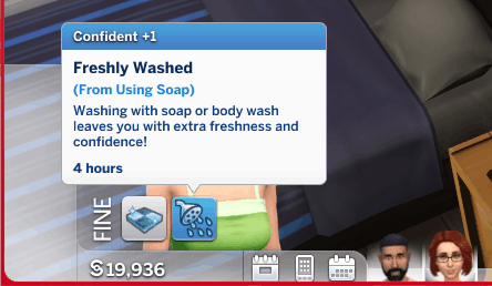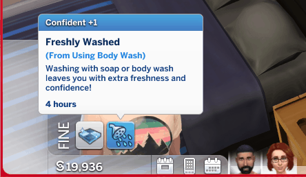 When a sim is taking a shower or a bath they now have an option to use these objects. It won’t add any extra animations on top of the shower or bath animations, but when the progress circle finishes they will get a custom buff based on the toothbrushing buff.