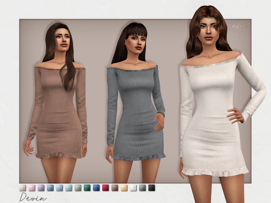 A short off shoulder dress with ruffles available in 15 colors for teen, young adult and adult sims.