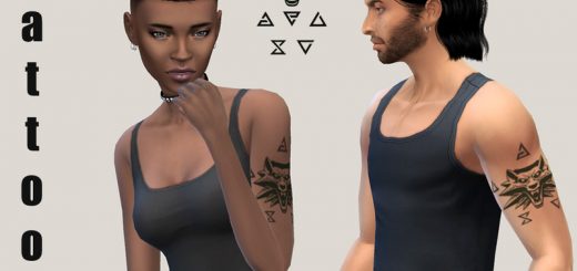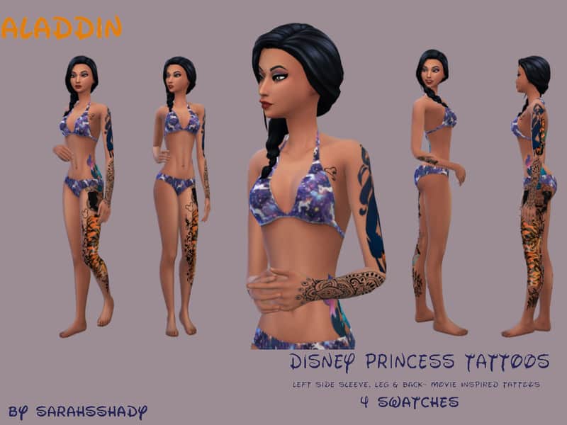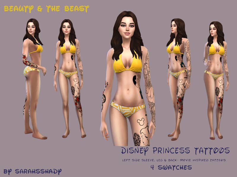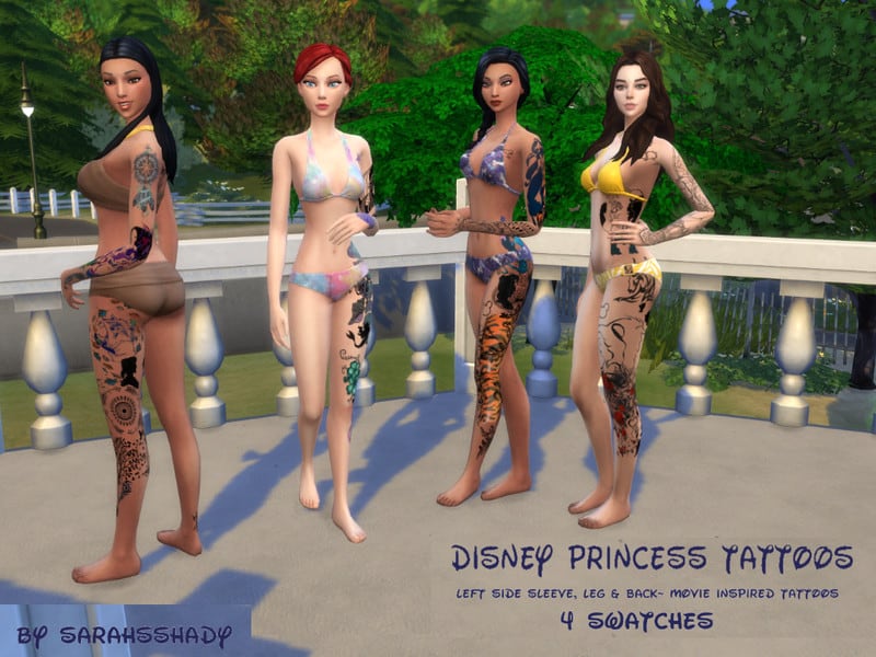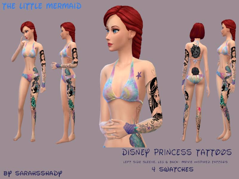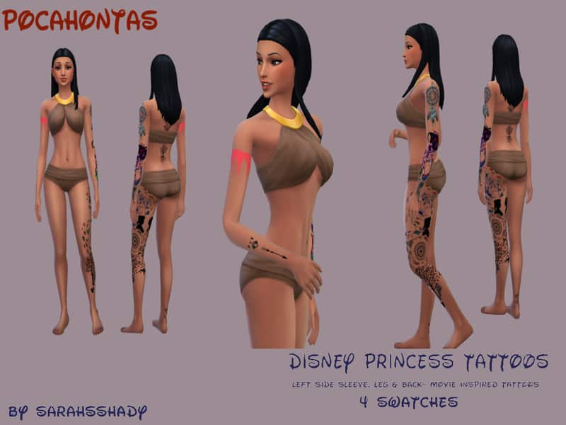 Each tattoo has the movie theme throughout. Tiger stripes and detailed henna for Jasmine, Fish scales and seashells for Ariel, Red Roses and stained glass for Belle, and Compass, leaves and arrows for Pocahontas. Each one is very different and unique to their respective princess/ movies. These can be layered with other tats in game. 4 Swatches