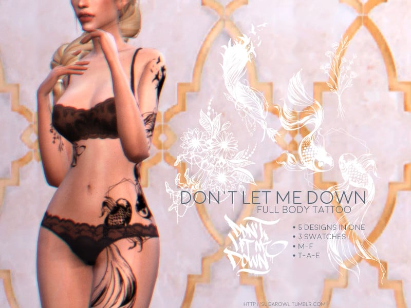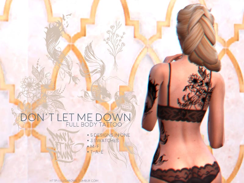 Our database contains only the highest quality Sims 4 mods that meet the most stringent requirements, like Don’t Let Me Down Full body tattoo Sims 4 Mod. This guarantees that our visitors have access to the most exclusive and useful files.