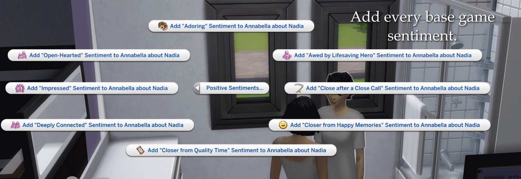 Every sentiment in the game comes with a unique relationship track—a relationship track is exactly what it sounds like; it tracks your relationship with another Sim. What each interaction does is set your relationship track for the chosen sentiment to 100. Because of that, you can only add sentiments to your Sim about another Sim. In other words, you cannot use this mod to give someone else a sentiment about your Sim. However, if that Sim is in your control, you can easily just select them and do that.