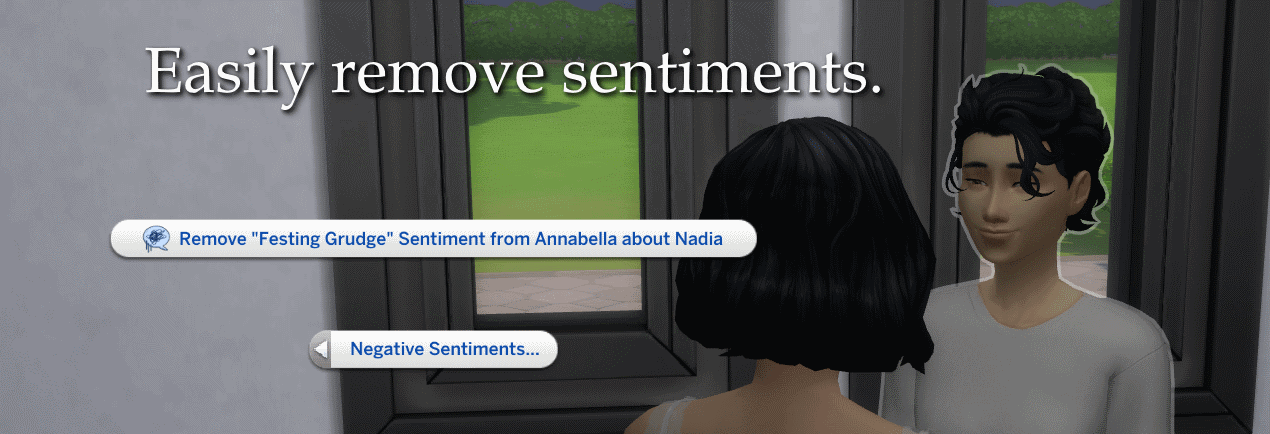 For the sentiment to be truly gone, the bit must be removed, which is quite a lot of work to code for every sentiment on the backend. Currently, the sentiments that can be removed are Festering Grudge, Furious, Deeply in Love, and Deeply Connected. With time, every sentiment will be included in this mod! The immediate ones on my bucket list are Hurt, Deeply Wounded (this one bugs me to no end), Closer from Happy Memories, and Closer from Quality Time.