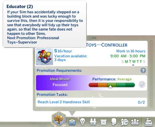 The carreer has ten levels that your Sim can reach, teenagers and adults are able to work in the kindergarten. If your Sim want to get promoted, he must improve different skills like charisma or comedy.