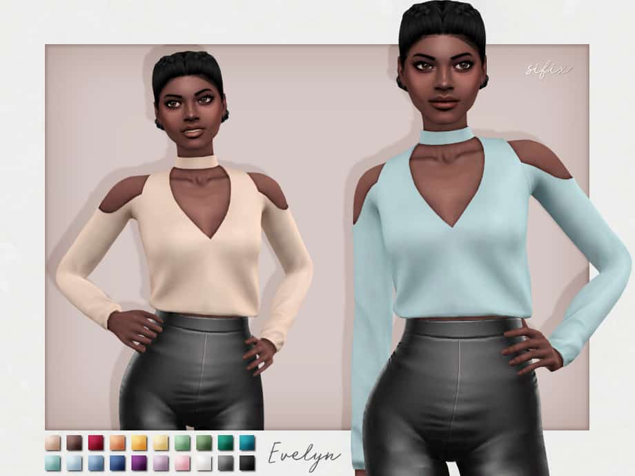 An off-shoulder keyhole top available in 20 colors for teen, young adult and adult sims.