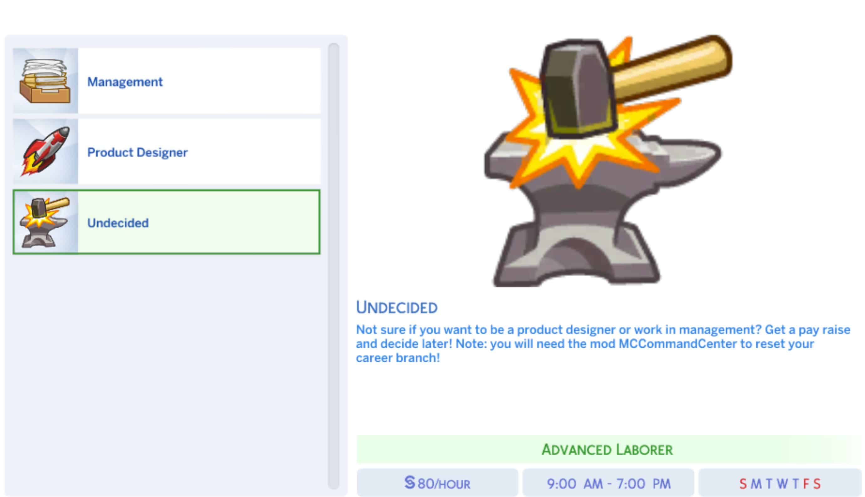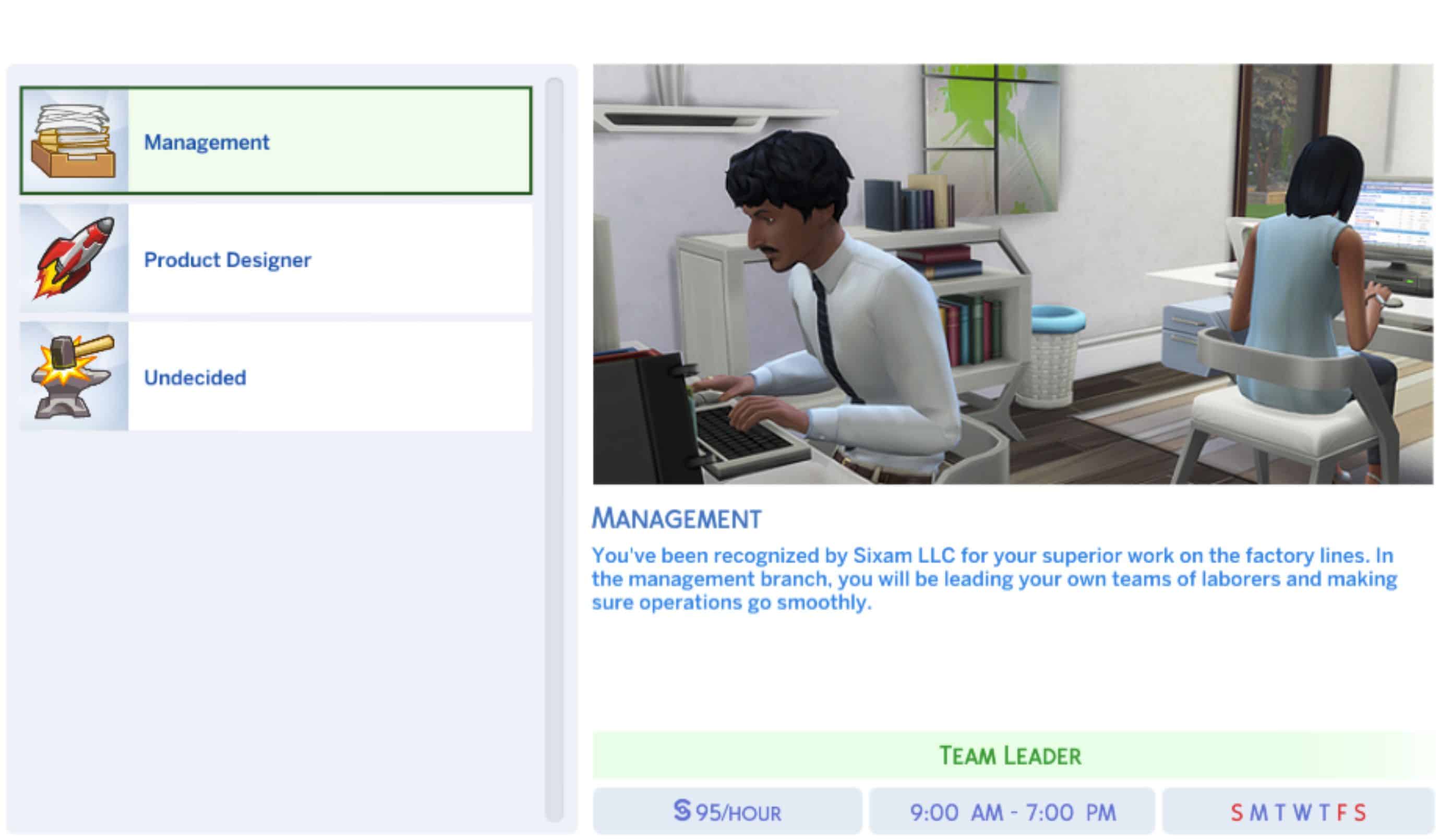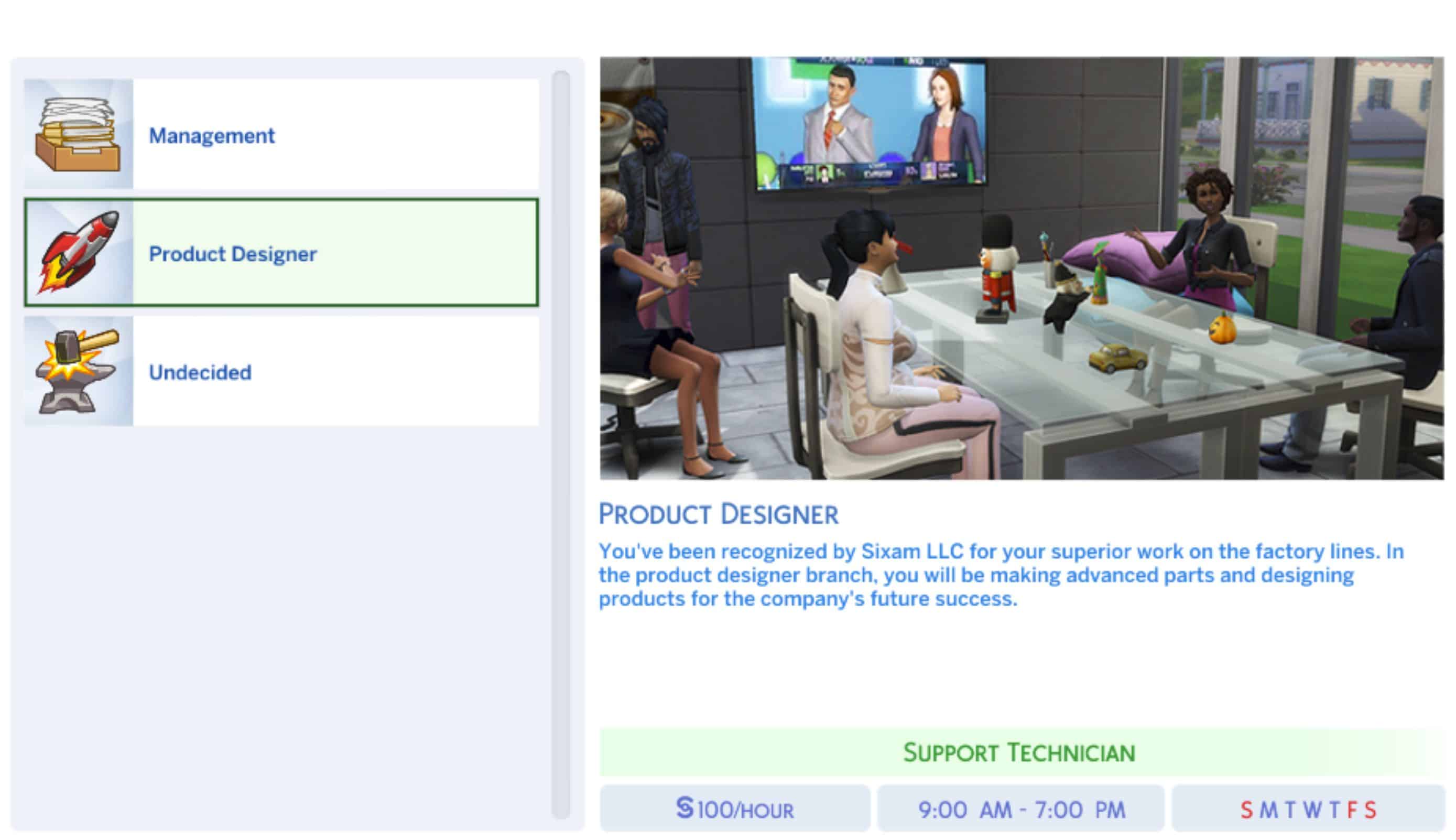 There is a full-time option with 3 branches leading you down the management, product designer, or undecided route. The management route focuses on charisma and handiness, while the product designer route focus on handiness and rocket science. In the undecided route, for gameplay purposes, if you want your sim to just stay where they are in their career, that is an option. If they change their mind later use MC Command Center to reset your career branch. Your sim works full time and start’s their work day at 9 am but each day is 10 hours each and it’s Monday-Thursday. There is more vacation days when starting this career compare to the normal 3 with most careers.