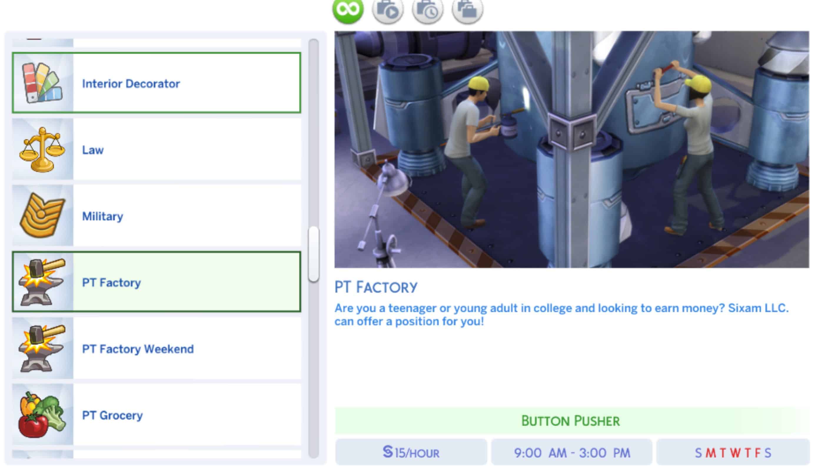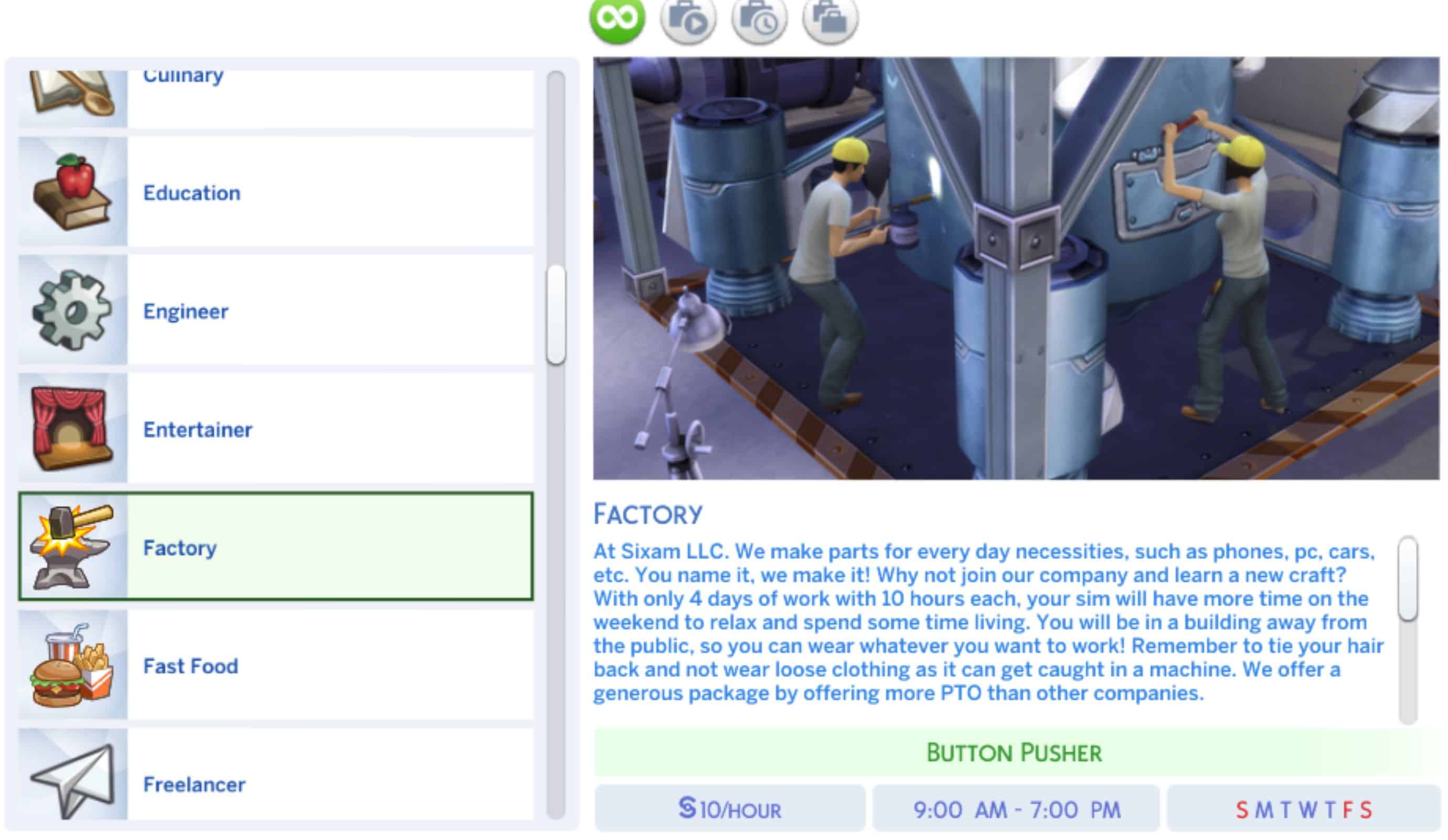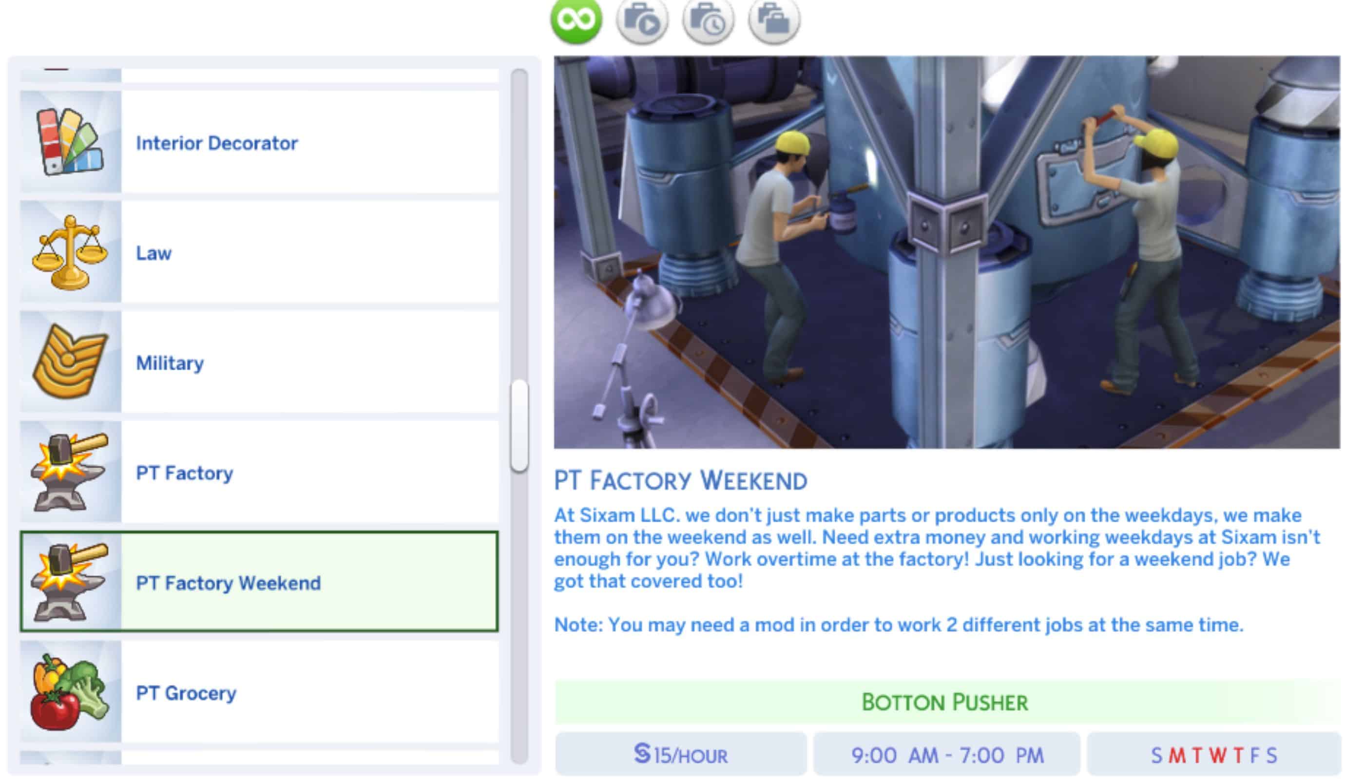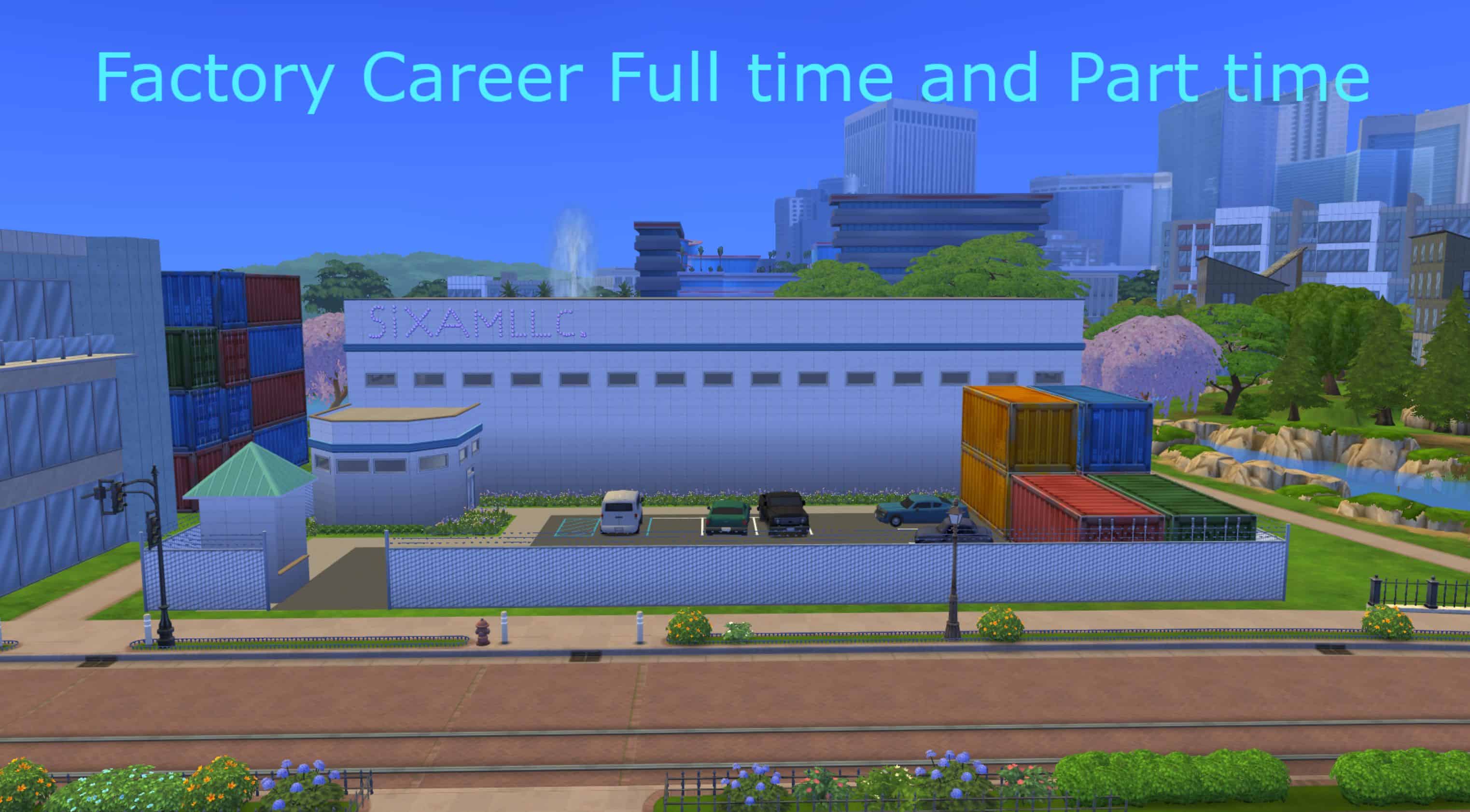 This a factory career mod where your sim has the option to work full-time or part-time. Or both if money is a goal for your sims.