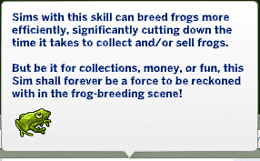 Okay, so. Ever wanted a Frog Breeding skill? Me neither, but breeding frogs seems to be all the rage nowadays. I hear there’s a scenario or something, it might have gone a bit over my head. But let’s be real, Sims gain skills all the time, and not all those skills are necessarily the best things out there. So.