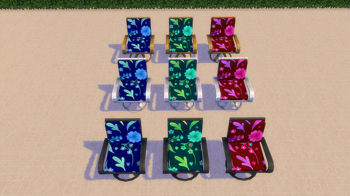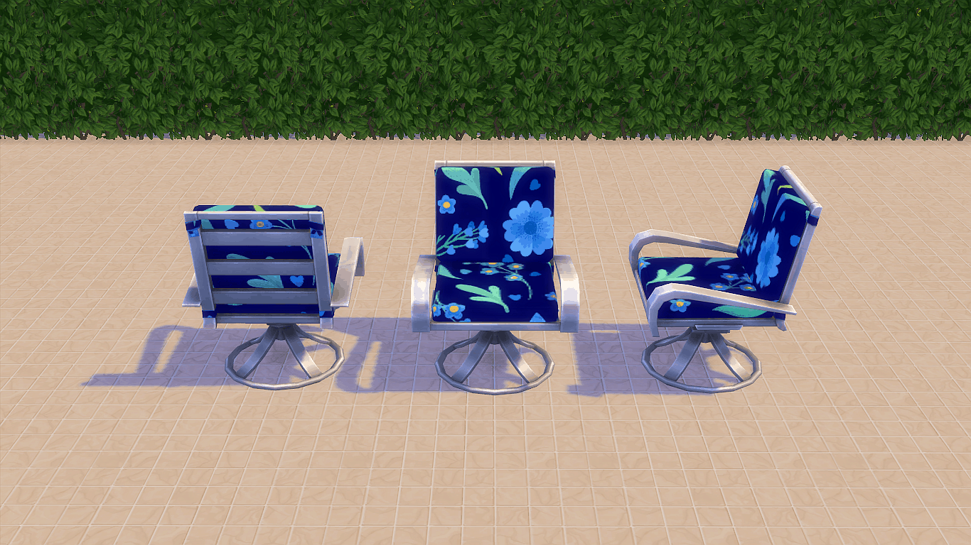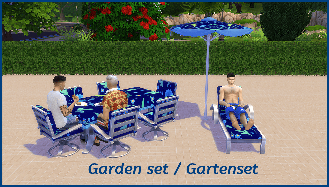 This garden furniture came with an update, I always thought it was a shame that the chairs did not go to the matching table, so I changed it so that the chairs also fit the table. I also added a new pattern to the table, it always bothered me that no matter which chair you take, the feet of the Sim always hang on the table leg, I also changed that you can see in a picture