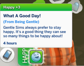 They have a unique random Happy moodlet- What A Good Day! +3 Happy: Gentle Sims always prefer to stay happy. It’s a good thing they can see so many things to be happy about!