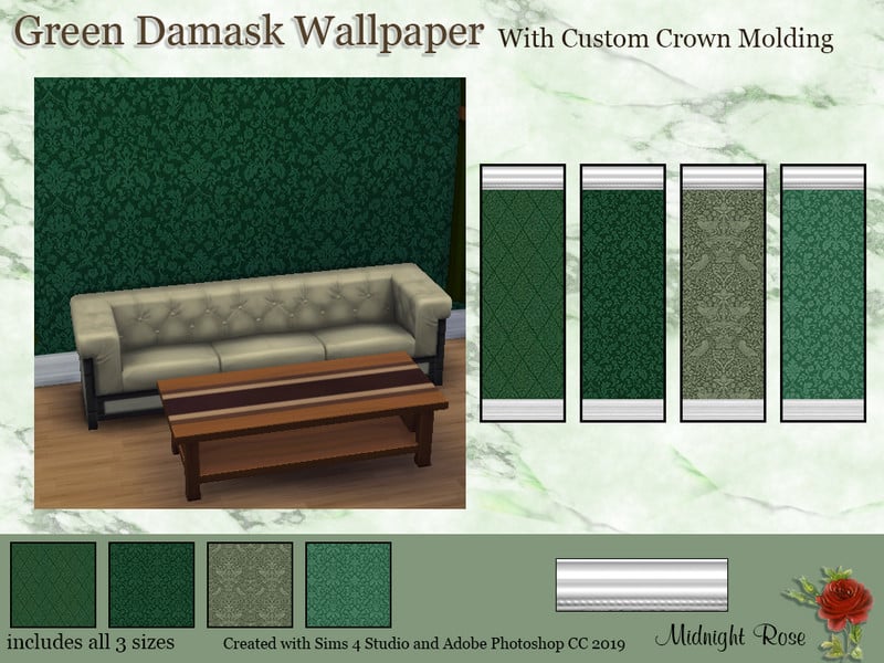 Rich Green Damask wallpapers to dress up your sims home.