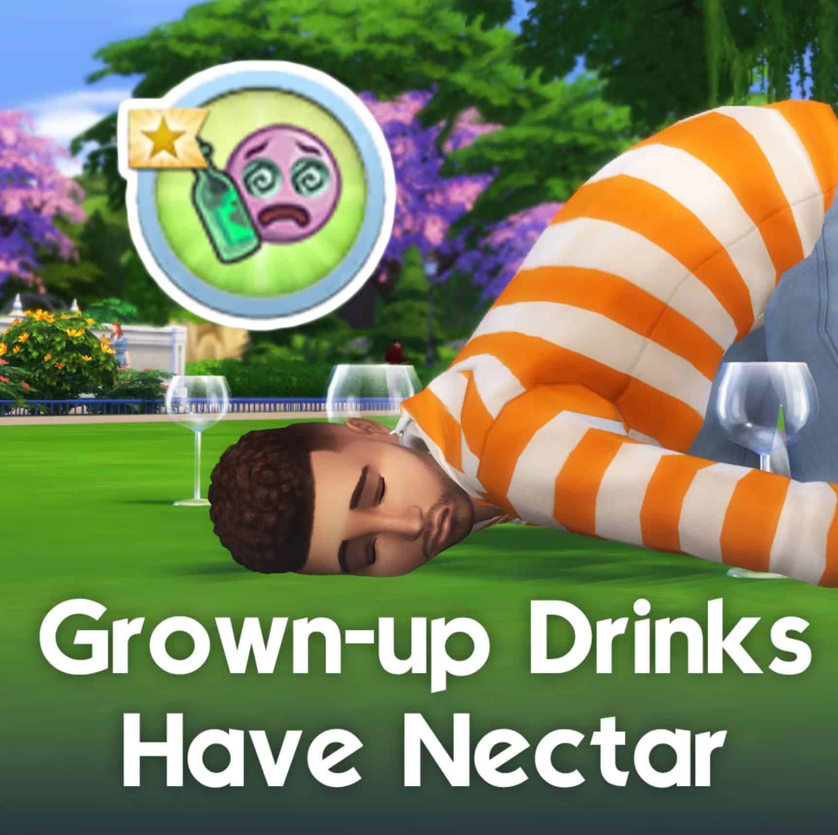 It simply injects a checker to all drink interactions to check whether the drink being consumed has the tag Drink_Alcoholic. If the check finds it, it will give the same happy moodlets you get when drinking nectar. 4 drinks with that tag and your sim is “Over-Nectared” and passes out and wakes up with “Afterglow”.