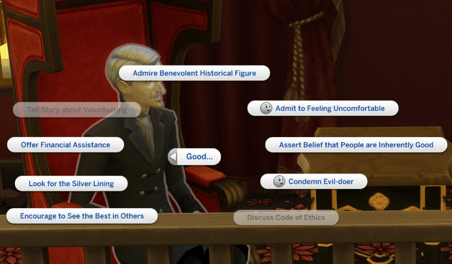 All interactions are set to be autonomous, so that your Evil and Good sims have their life skills, reputation and behavior appropriate to their character even while you’re not actively playing them. I’m open to feedback on this – let me know your thoughts.
