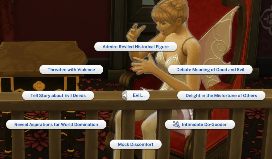 All new social interactions are contained within the new Good and Evil pie menus (including those unique to the new lot traits). Each interaction reveals Good and Evil traits to Actor and Target Sims.
