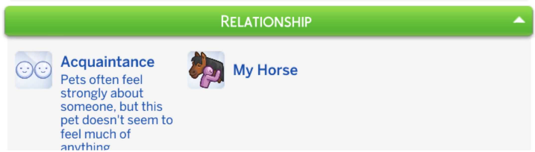 As of now, what this mod does is turn the HorseOwned* relationship bit visible (I added a HR icon to it, will probably adjust that in the future so it fits in with other relationship bits but for now I think it’s a rather cute one!) and adds interactions to add or remove ownership of a horse. Only the horse’s owners can sell their owned horse(s). You’re also able to own horses that live outside your household, and remove the household members as owners, so you can e.g. have them live at a set-up boarding stable with sims taking care of them. (I am also working on a mod to bring realistic horse stables to The Sims 4, so stay tuned!)