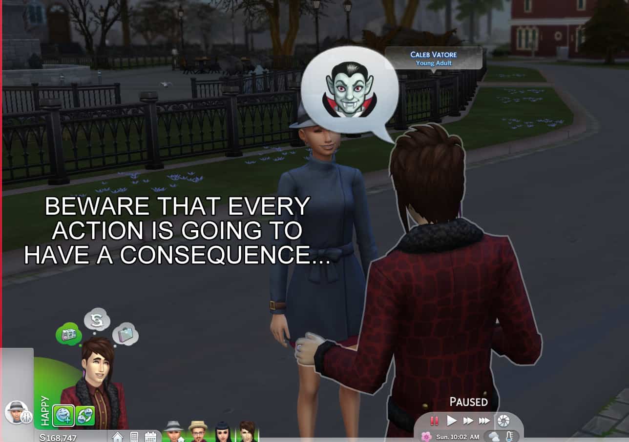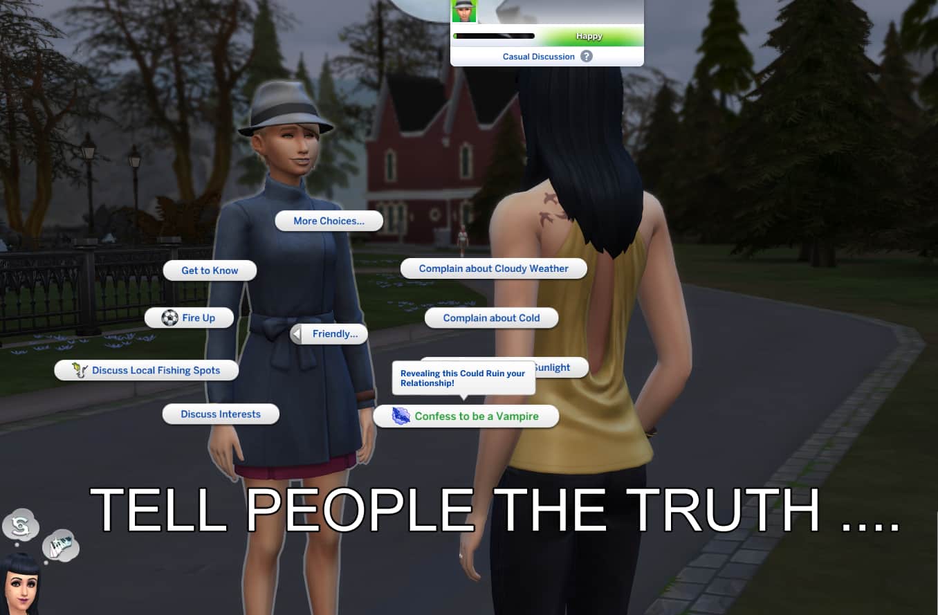 Confessing to a Sim only takes a click, there are various outcomes: positive, negative and neutral. If you get a negative or neutral response, two new options will unlock: “Tell you were joking” and “reassure about vampires”. While Sims that gave you a positive response will have a positive opinion about vampires right away, the outcome of these two interactions will decide the opinion of the sims who gave you a neutral one, and you can pick only one, or leave things as they are. Negative responses bring to a negative opinion, if the outcome of one of the two followin interactions is positive, though, you can flip your interlocutor opinion on vampires.