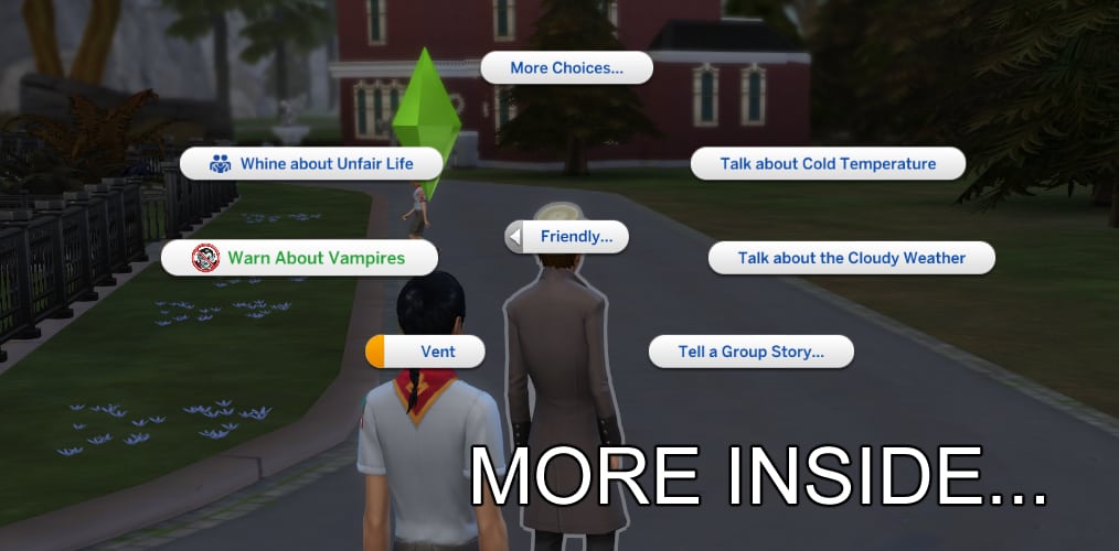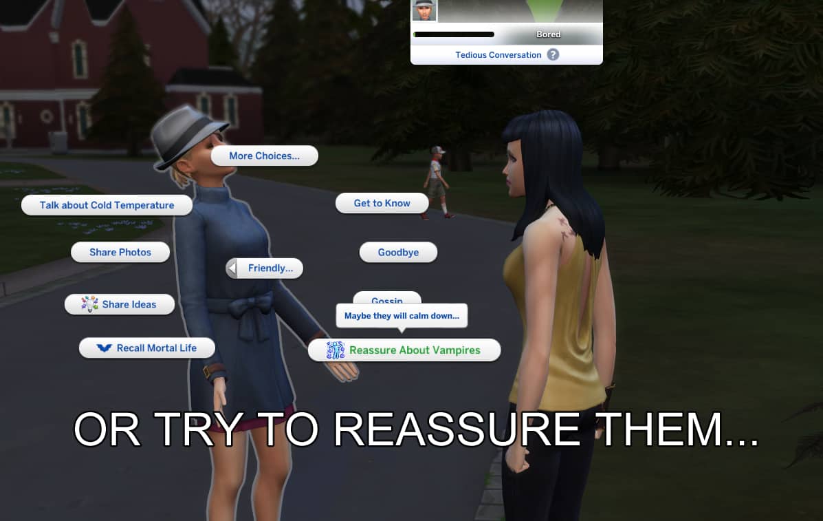 Vampires too will get tense around Sims who knows their secret, all but the ones that are trusted by someone. If someone forms a positive opinion on you through a positive reaction to a confession, new interactions will unlock for them: they will have the possibility to “Ask if Vampire” to other sims, “Ask Opinion on Vampires” to other sims, that will unlock the option to “Reassure about vampires” if their opinion is bad or neutral or “Reassure about humans” vampires. These interaction have the chance to change people opinion on vampires.