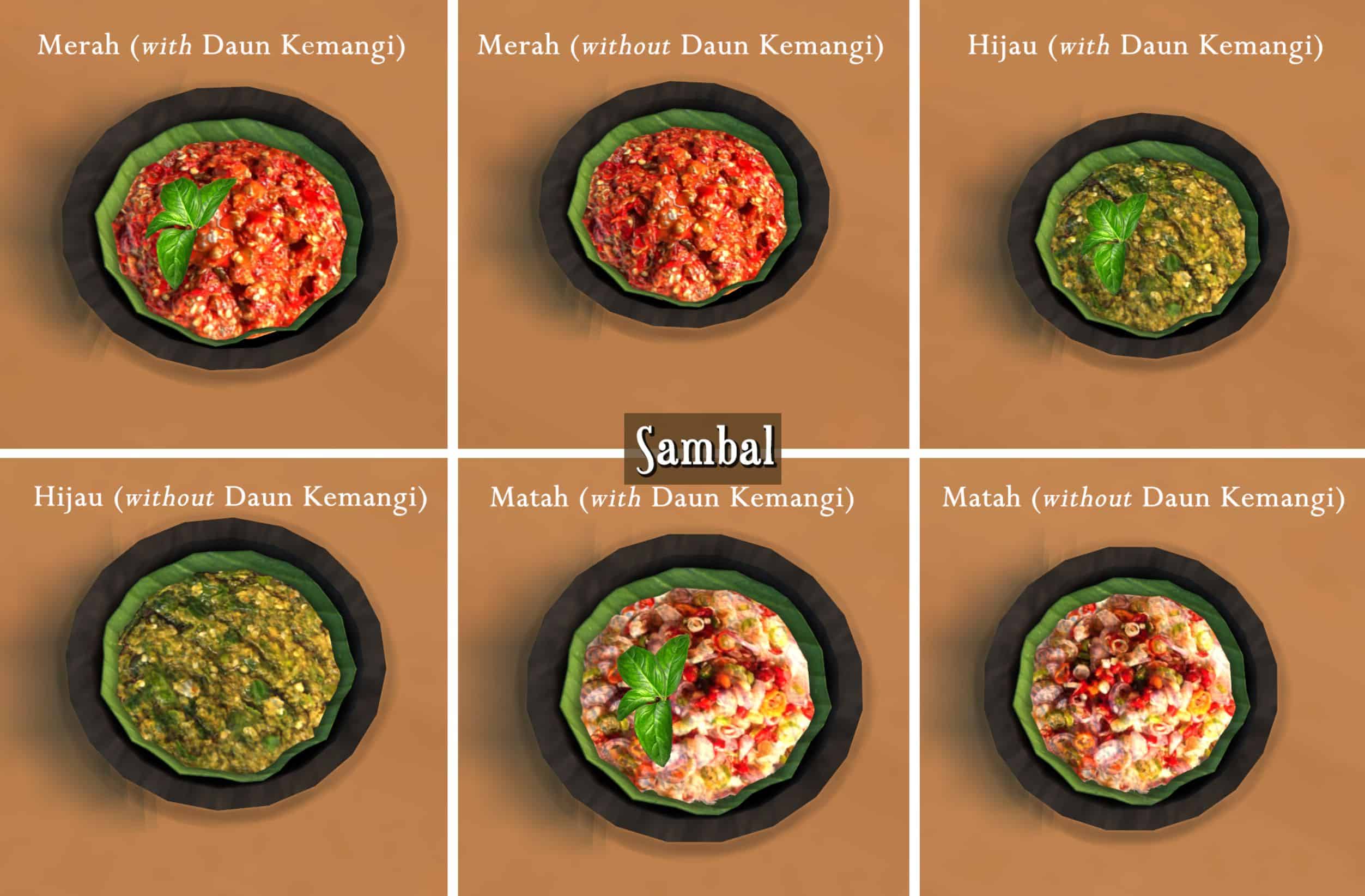 Indonesian food generally have Sambal option, therefore a lot of Indonesian food are served spicy. Sambal merah = red chili sauce, Sambal Hijau = Green cayenne chili sauce, Sambal Matah= Raw red onion chili sauce with red chili, shrimp paste, lemongrass and lime leaves. From Bali, province of Indonesia. The leaf is Daun Kemangi.