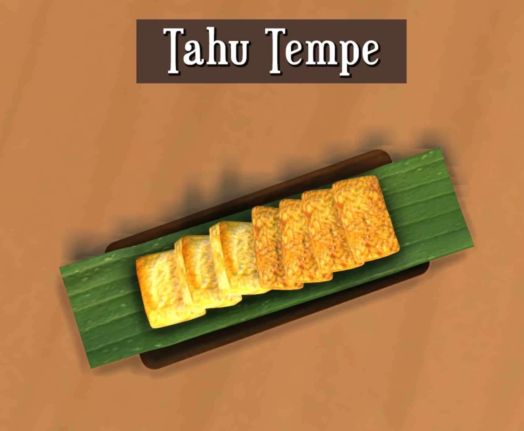 Tahu is Indonesian fried tofu (left) Tempe is original Indonesian fermented soybean, commonly served fried. (right)