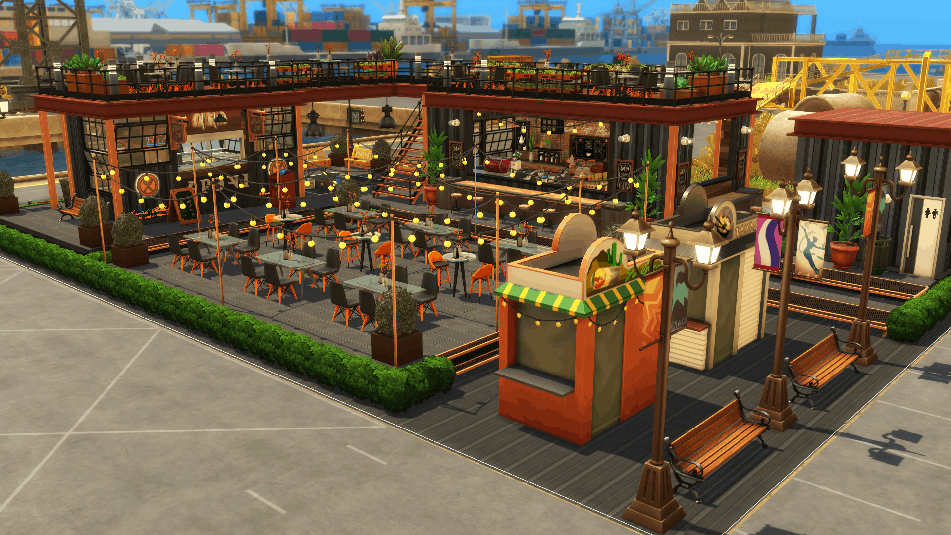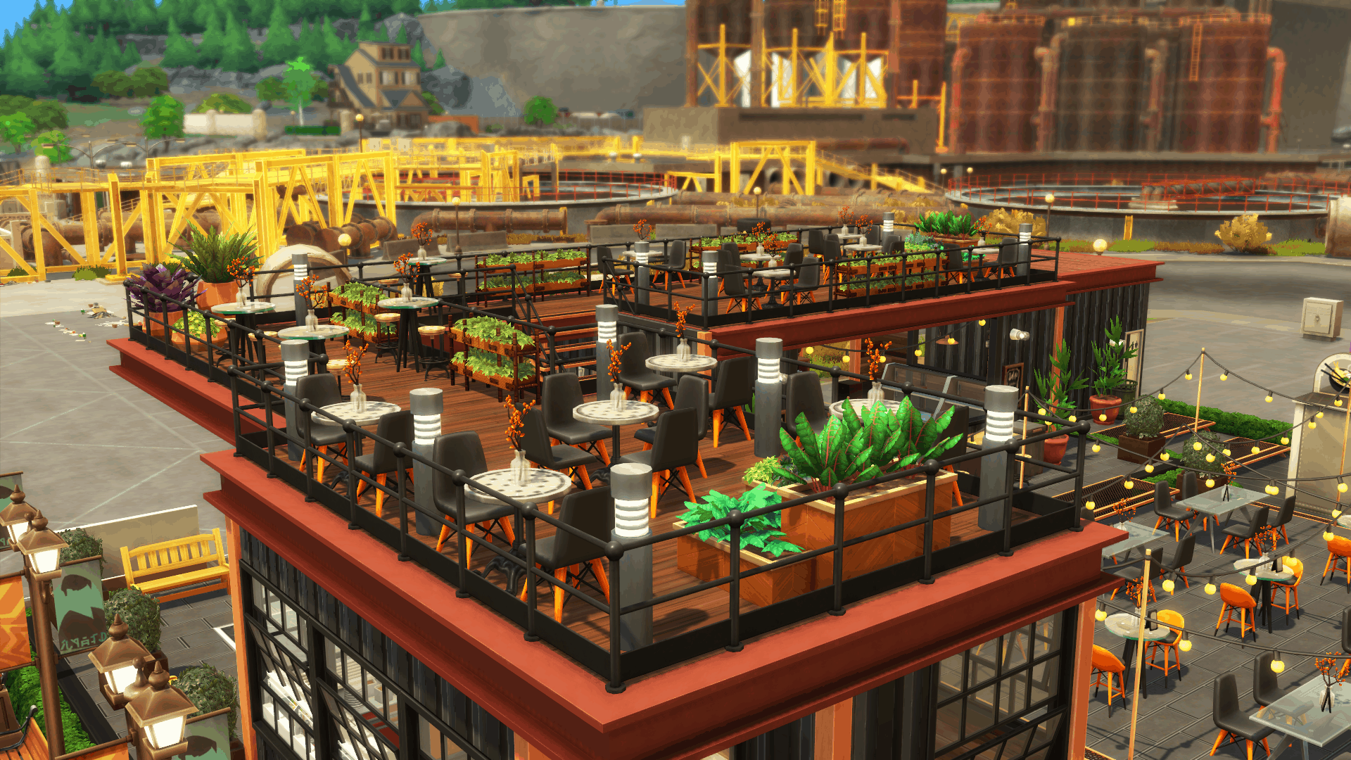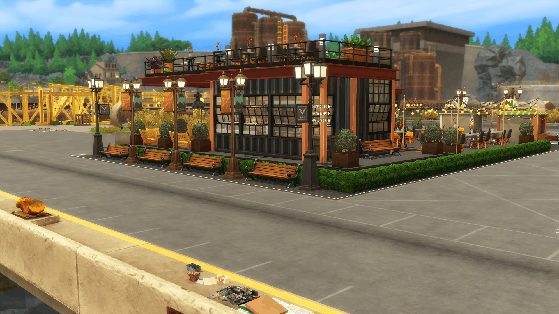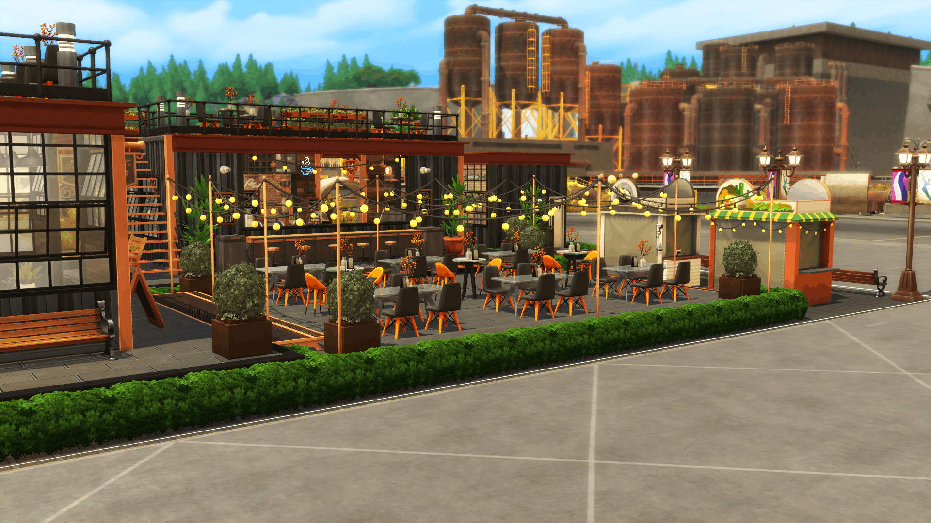Industrial style food parks are always one of my favorite places to visit so I decided to create one in The Sims! This community lot is situated in the heart of Evergreen Harbor in the lot The Shipping Views overlooking the polluted landscape of the city. This community lot offers an unassuming Michelin-starred restaurant as well as a cozy cafe. You can run the community lot as a Cafe but I recommend you running it as a Restaurant instead.
