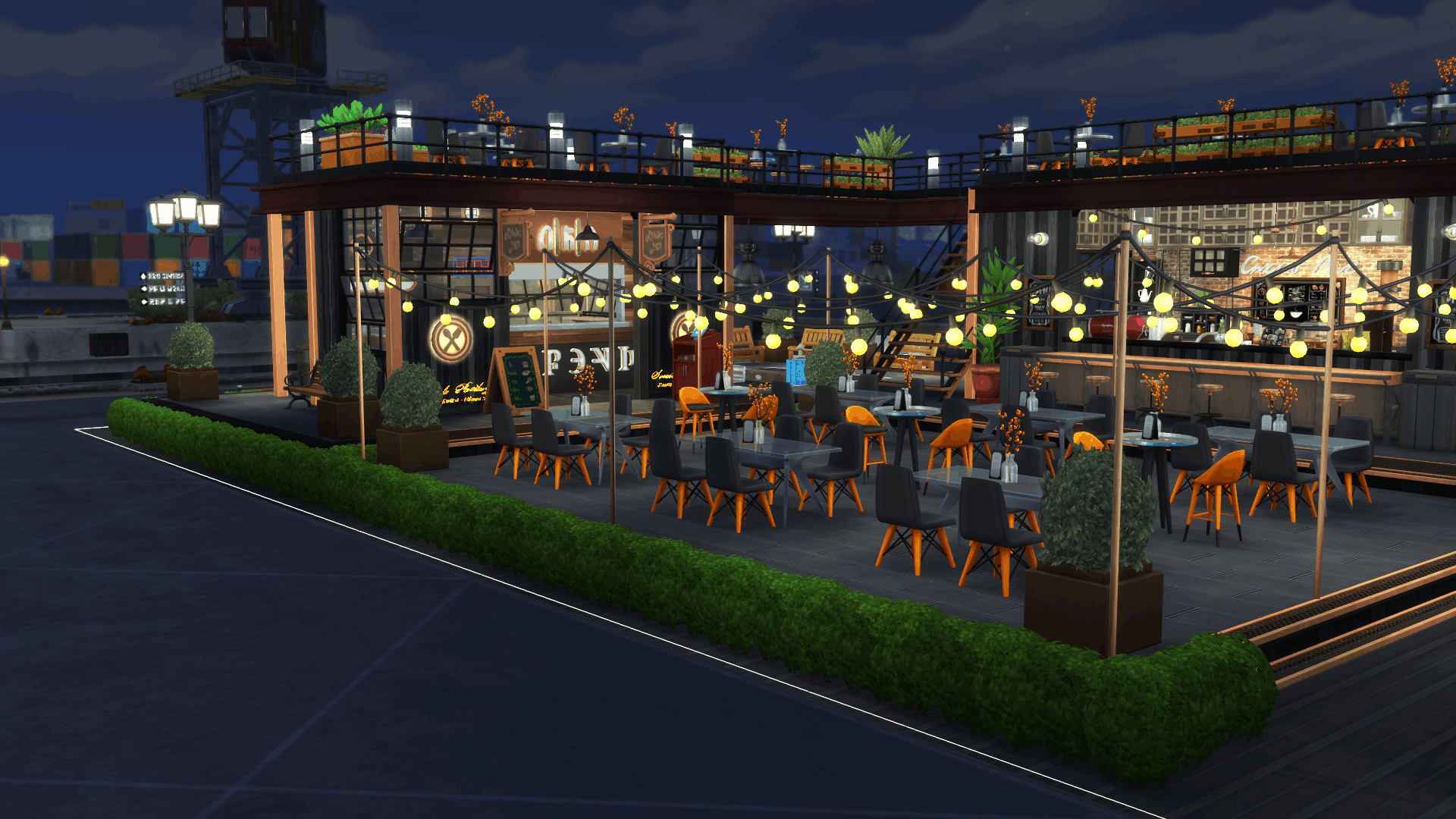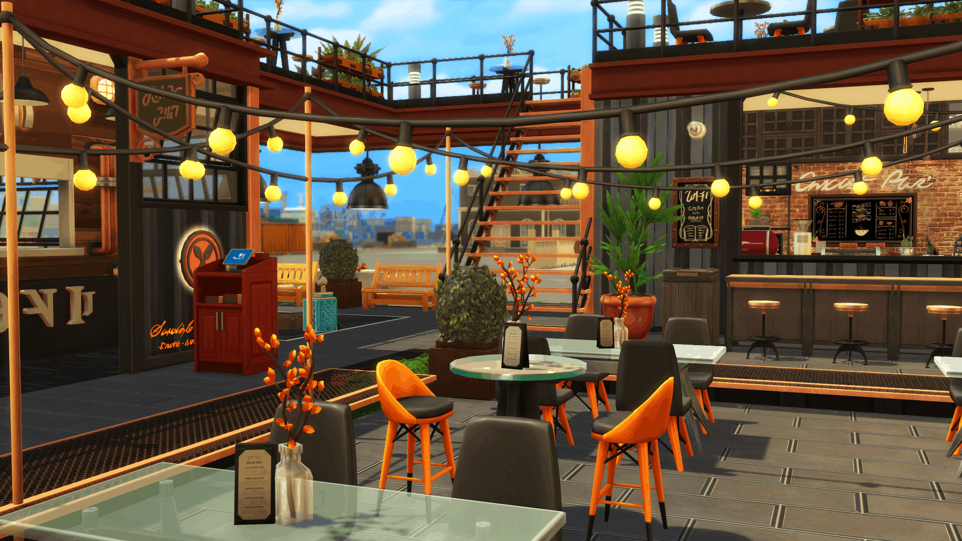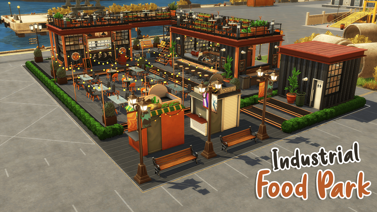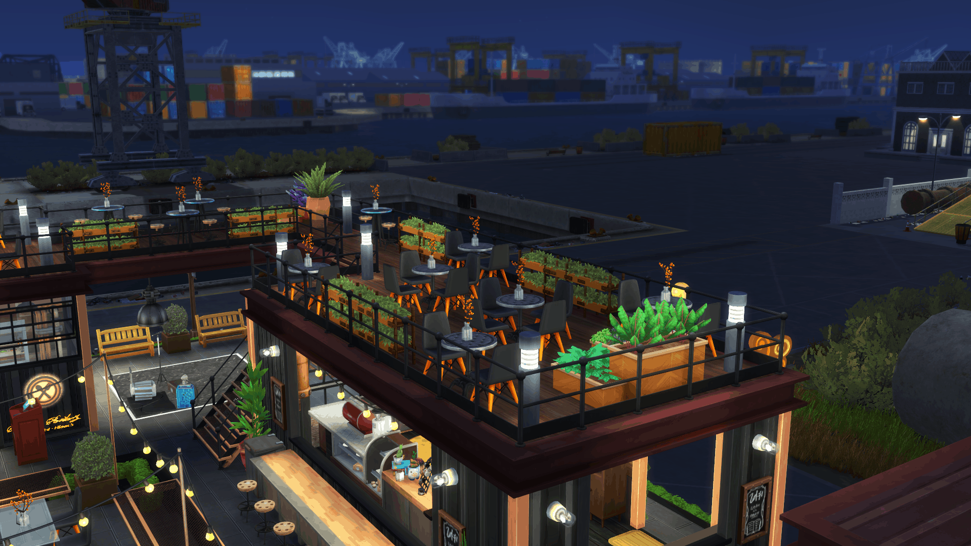 Industrial style food parks are always one of my favorite places to visit so I decided to create one in The Sims! This community lot is situated in the heart of Evergreen Harbor in the lot The Shipping Views overlooking the polluted landscape of the city. This community lot offers an unassuming Michelin-starred restaurant as well as a cozy cafe. You can run the community lot as a Cafe but I recommend you running it as a Restaurant instead.
