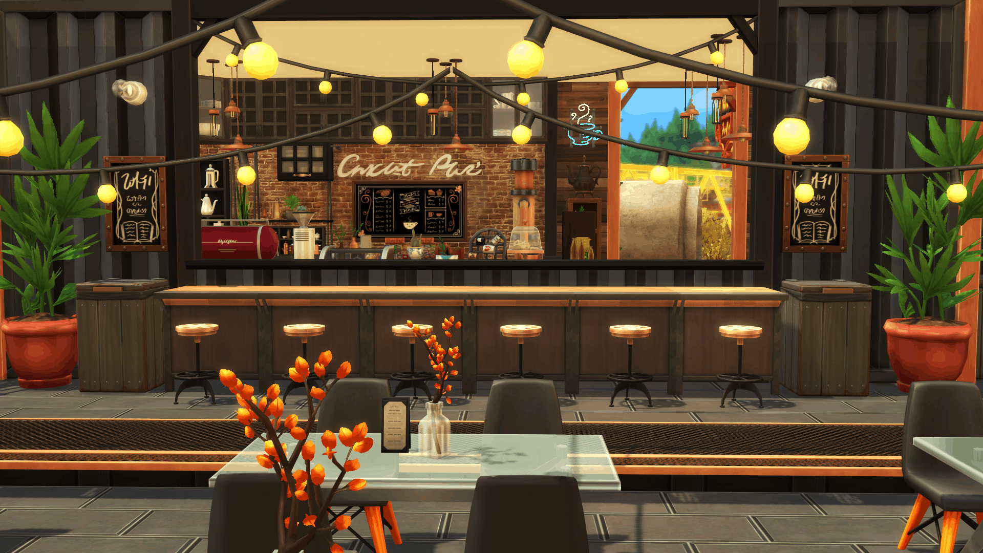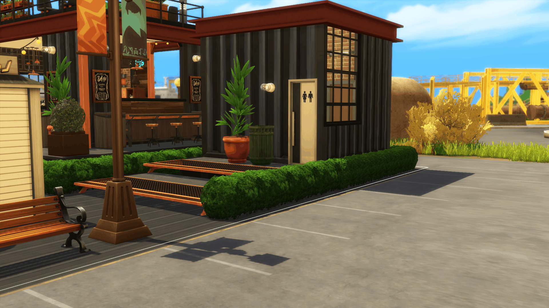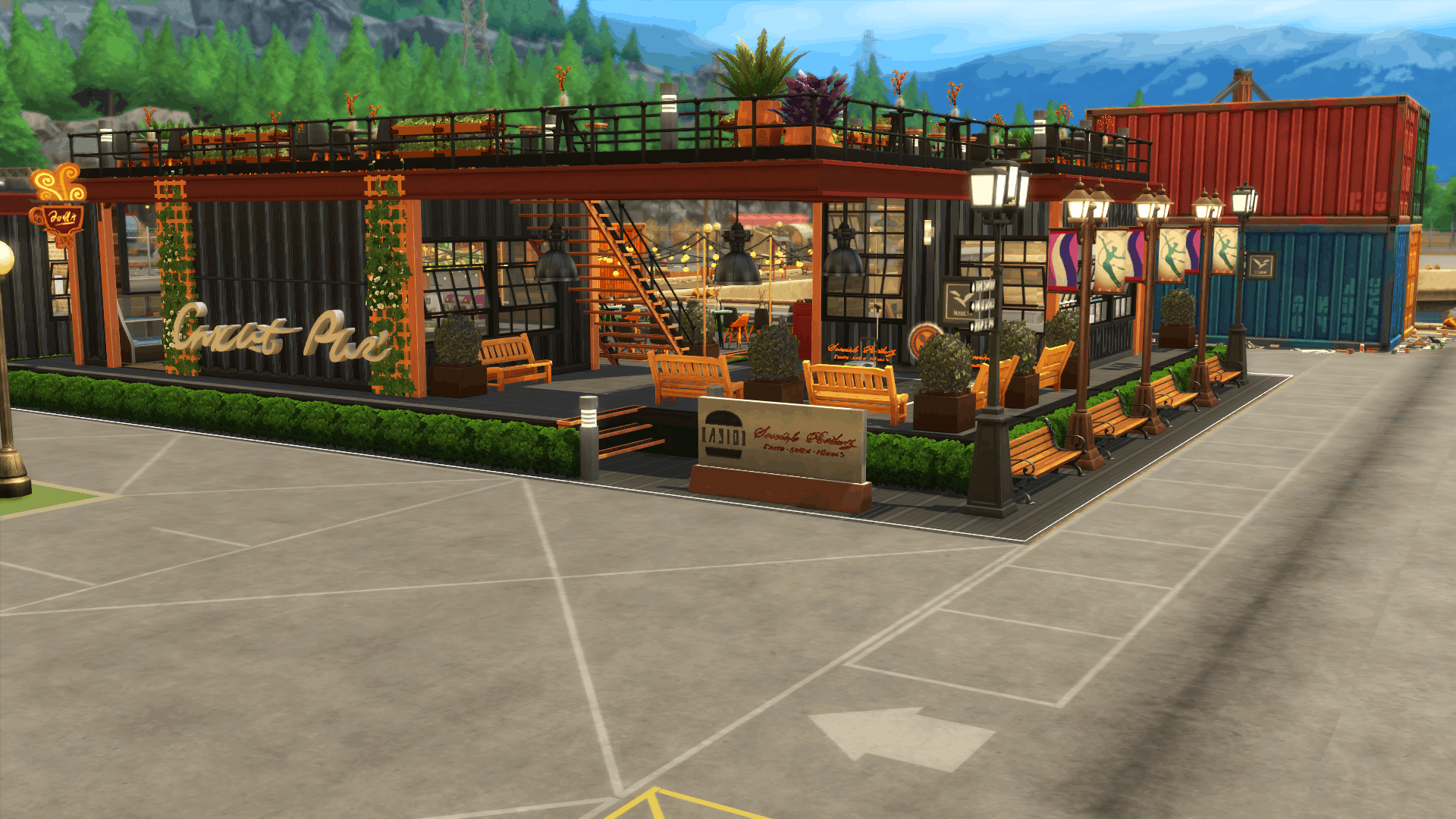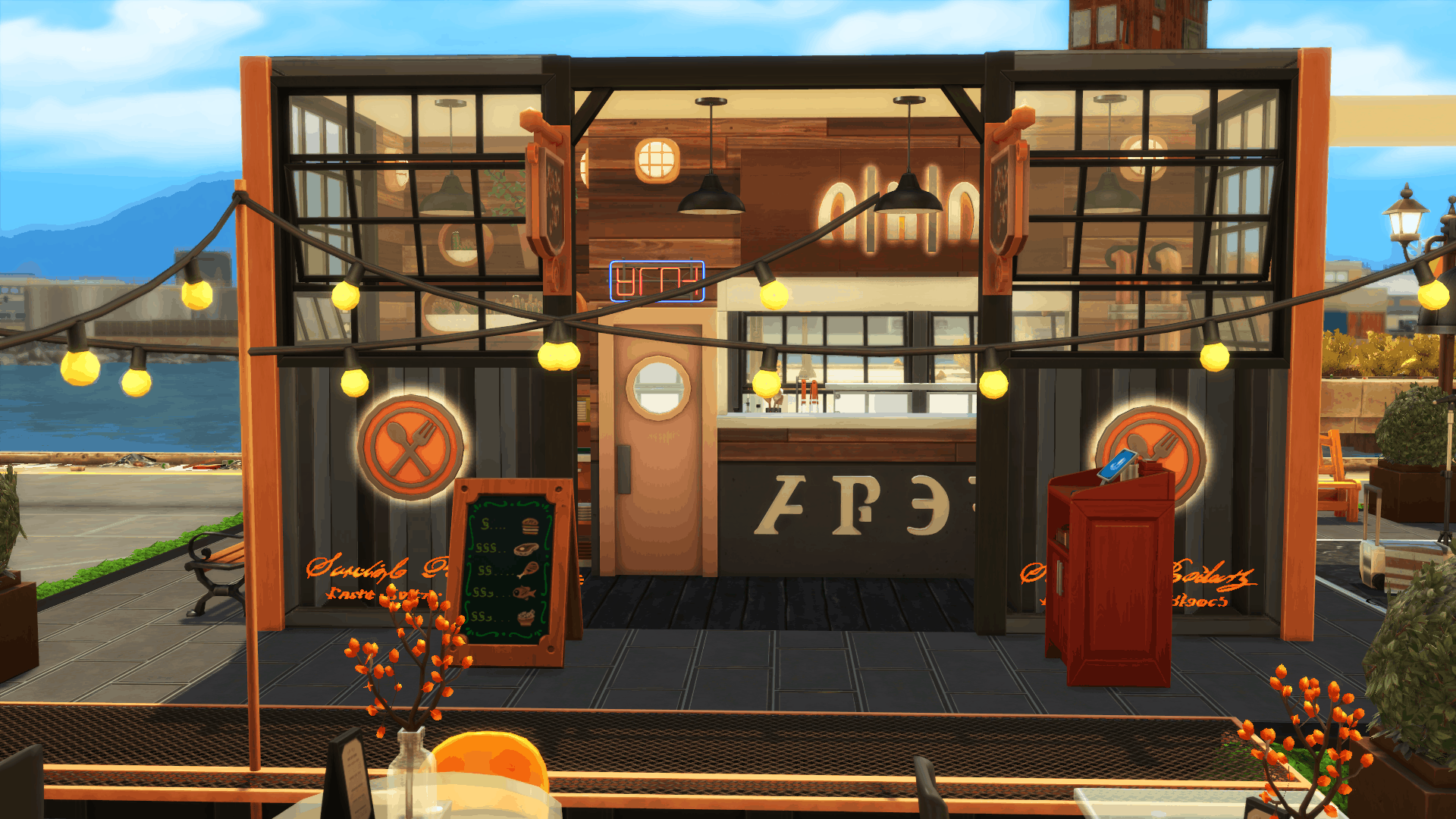 Industrial style food parks are always one of my favorite places to visit so I decided to create one in The Sims! This community lot is situated in the heart of Evergreen Harbor in the lot The Shipping Views overlooking the polluted landscape of the city. This community lot offers an unassuming Michelin-starred restaurant as well as a cozy cafe. You can run the community lot as a Cafe but I recommend you running it as a Restaurant instead.