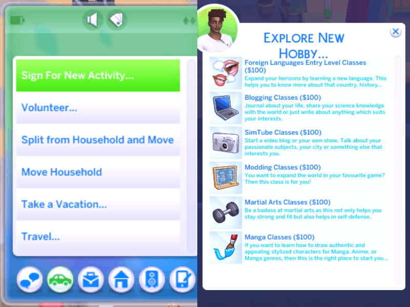Then you will be able to choose between 6 hobbies. Each hobby class costs $100, when your sim chooses a hobby, they will be gone (in a rabbit hole), for a while (taking a class). When they are back you will receive a notification with further information. After your sim returns, they will be able to use certain interactions on the computer connected to their hobby. Every single interaction helps with life skills, as well as developing practical skills. Keep in mind that these hobbies just touch up these subjects, since there are already aspirations and careers in the same fields. The hobby can last until the rest of their life, therefore if they age up with the hobby (you have the option to remove it if you want), they will be able to keep using it.