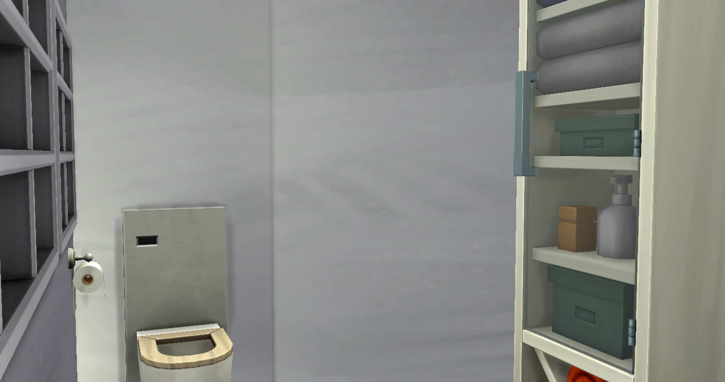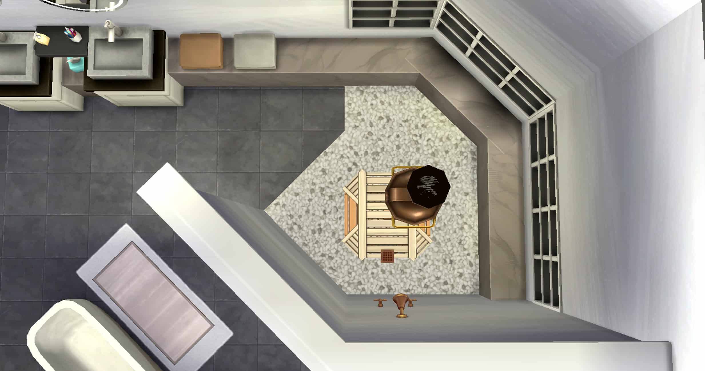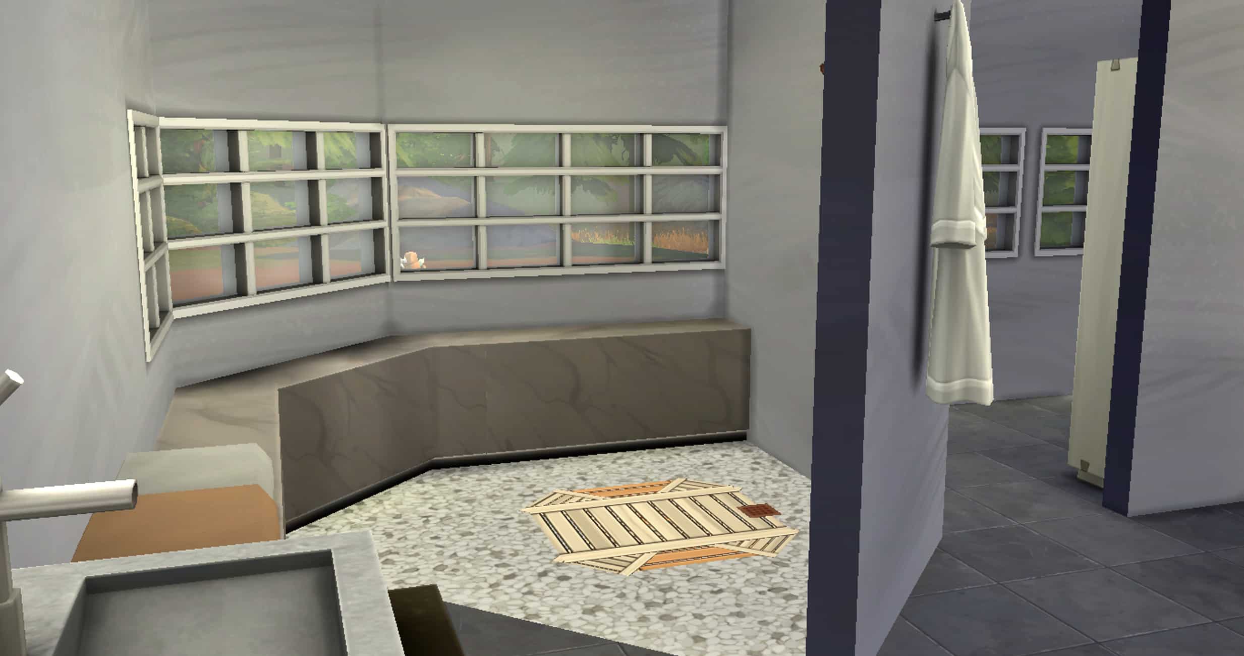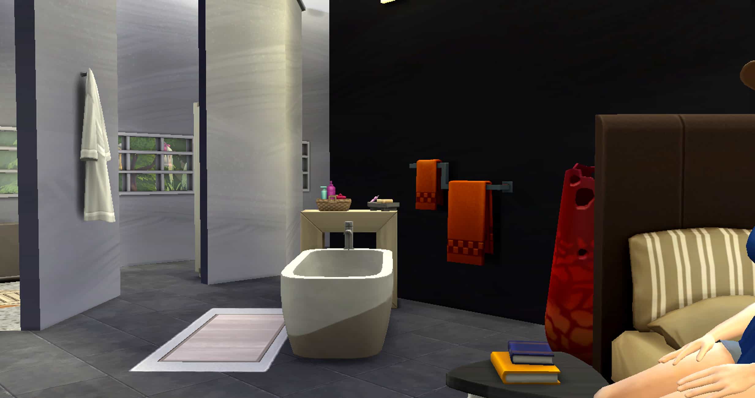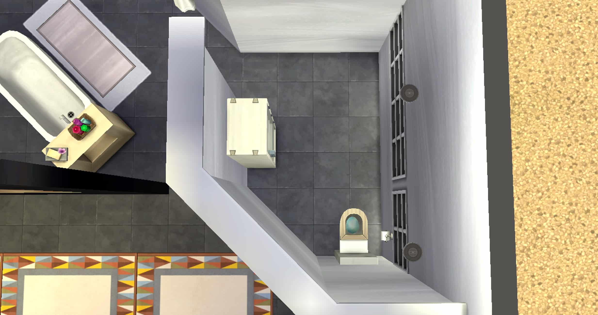 To the right of the entrance you reach the bedroom and bathroom area, the bathtub being located at the rear, the shower being separated by a wall, and the toilets behind the shower also separated by a wall.