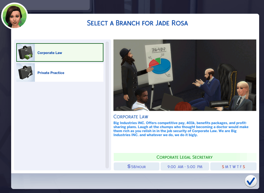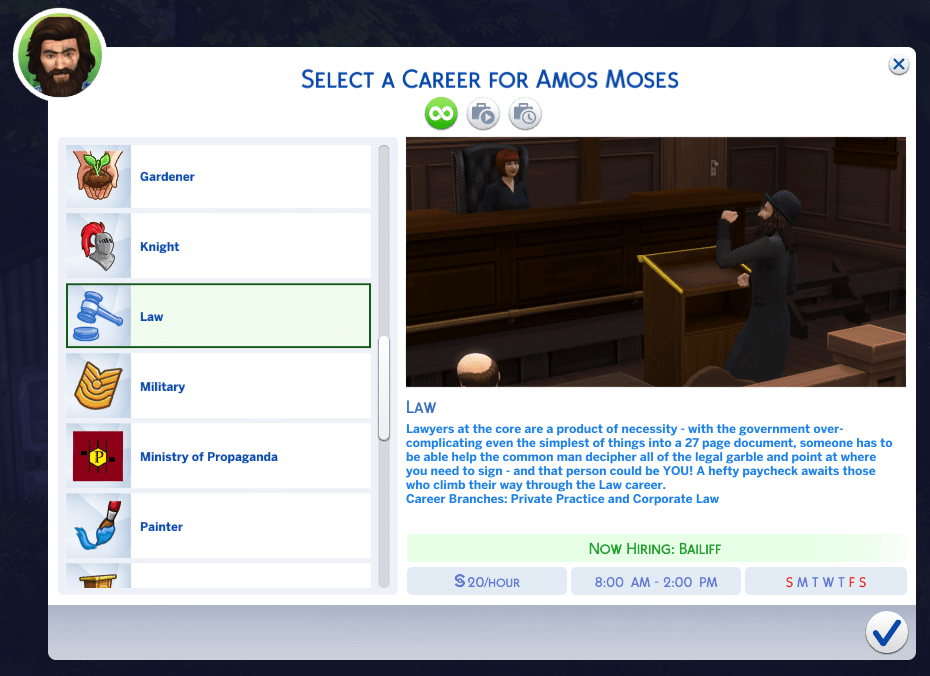 Inspired by Neia’s Law Career, with many changes such as: modified job titles, modified career requirements, changed working days/hours, all new career texts, and probably the most important change; income balancing to match the EA careers. (Does not include the Judge and Public Prosecution tracks).