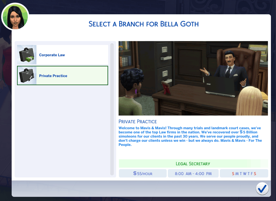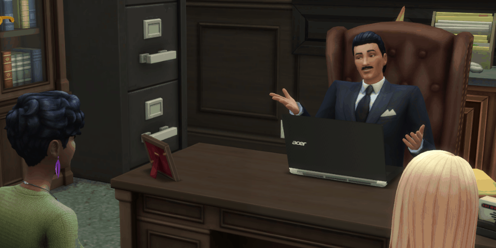 “Welcome to Mavis & Mavis! Through many trials and landmark court cases, we’ve become one of the top Law firms in the nation. We’ve recovered over §5 Billion simoleons for our clients in the past 30 years. We serve our people proudly, and don’t charge our clients unless we win – but we always do. Mavis & Mavis – For The People.”