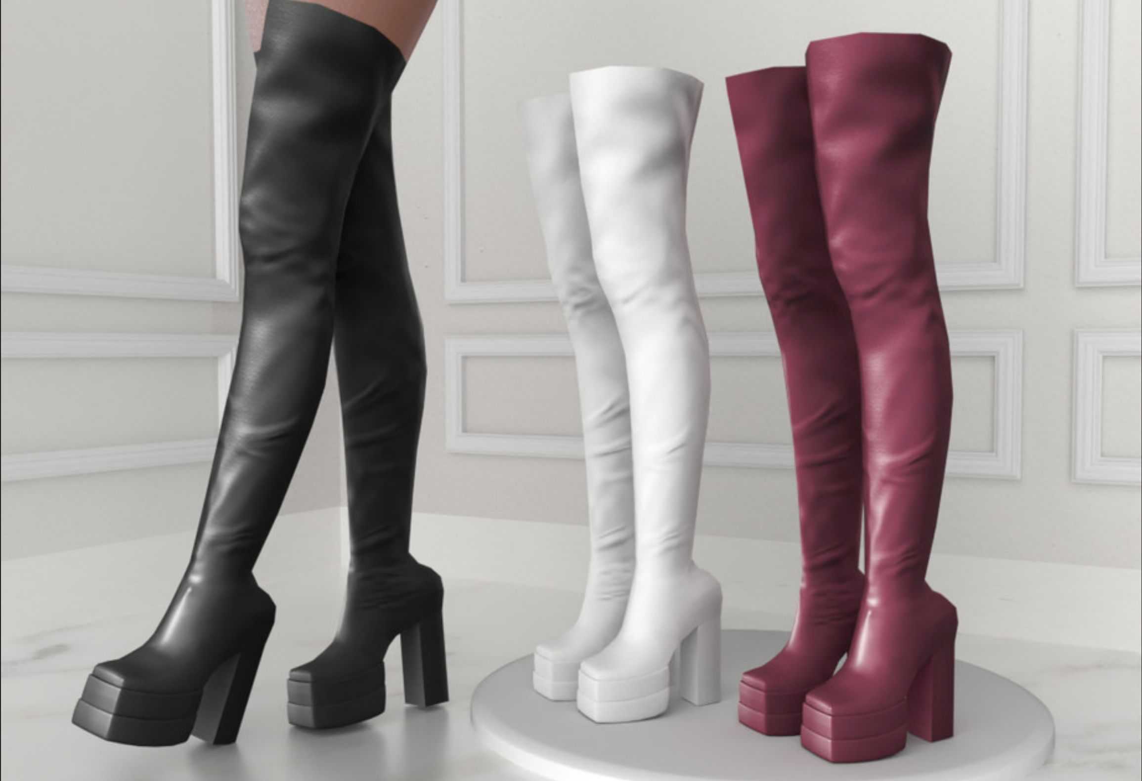 Stylish leather high heel boots for your sims for everyday use. Contains 30 swatches with different color combinations.