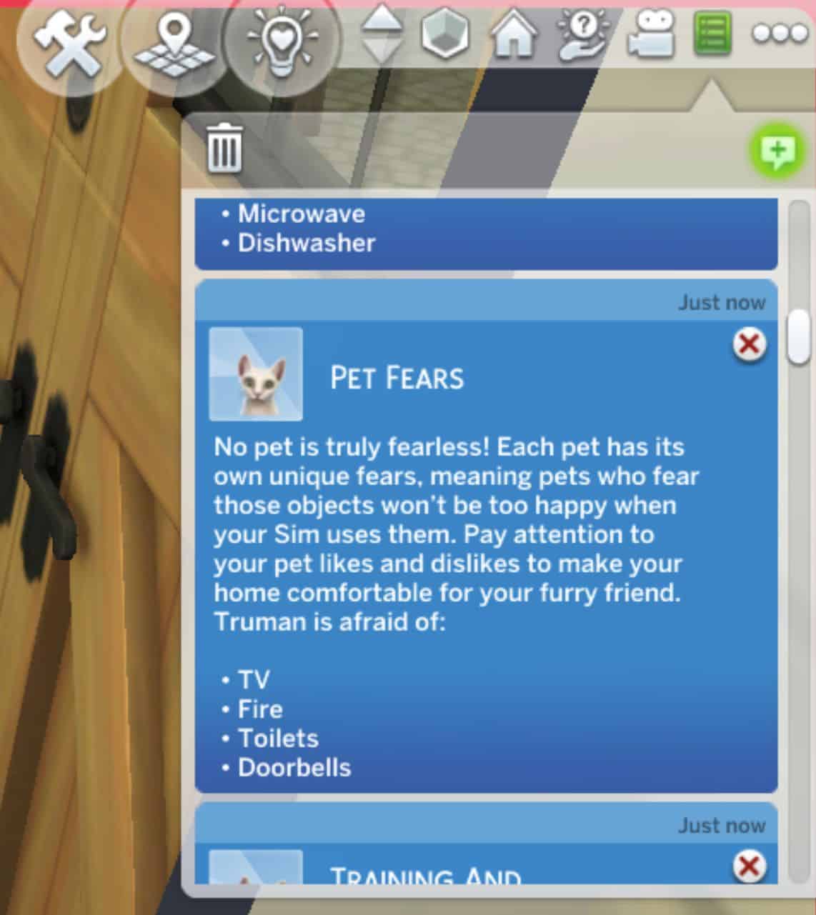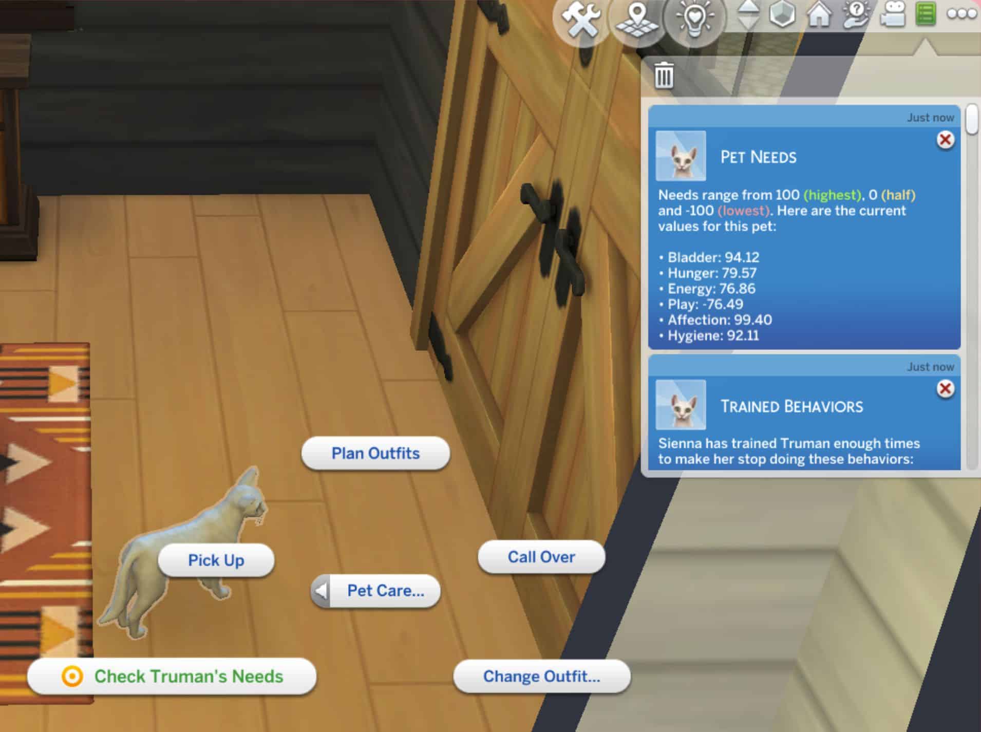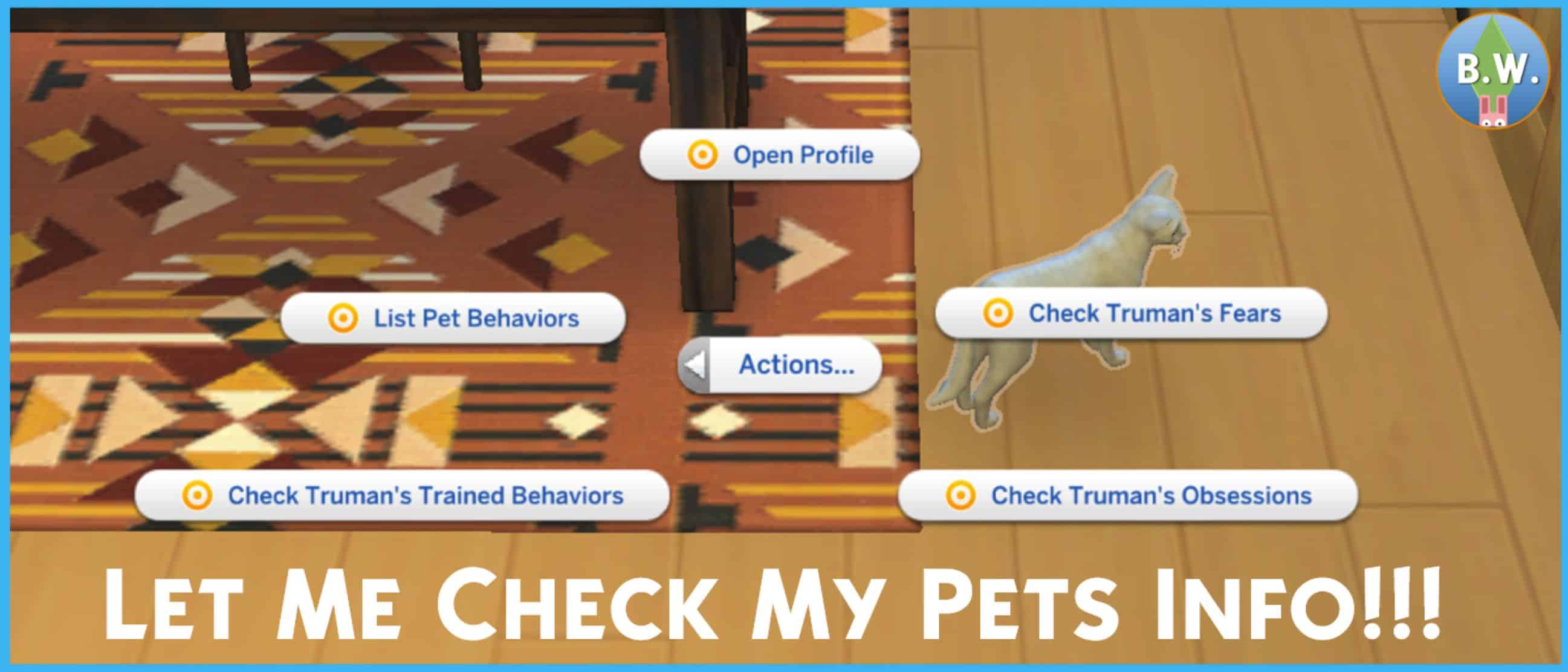 This mod makes so that you can check your pets informations via handy notifications that are able to display current Needs, Fears, Obsessions, Trained Behaviors and a list of all of the Behavior for the type of pet (small dog, big dog, cat).