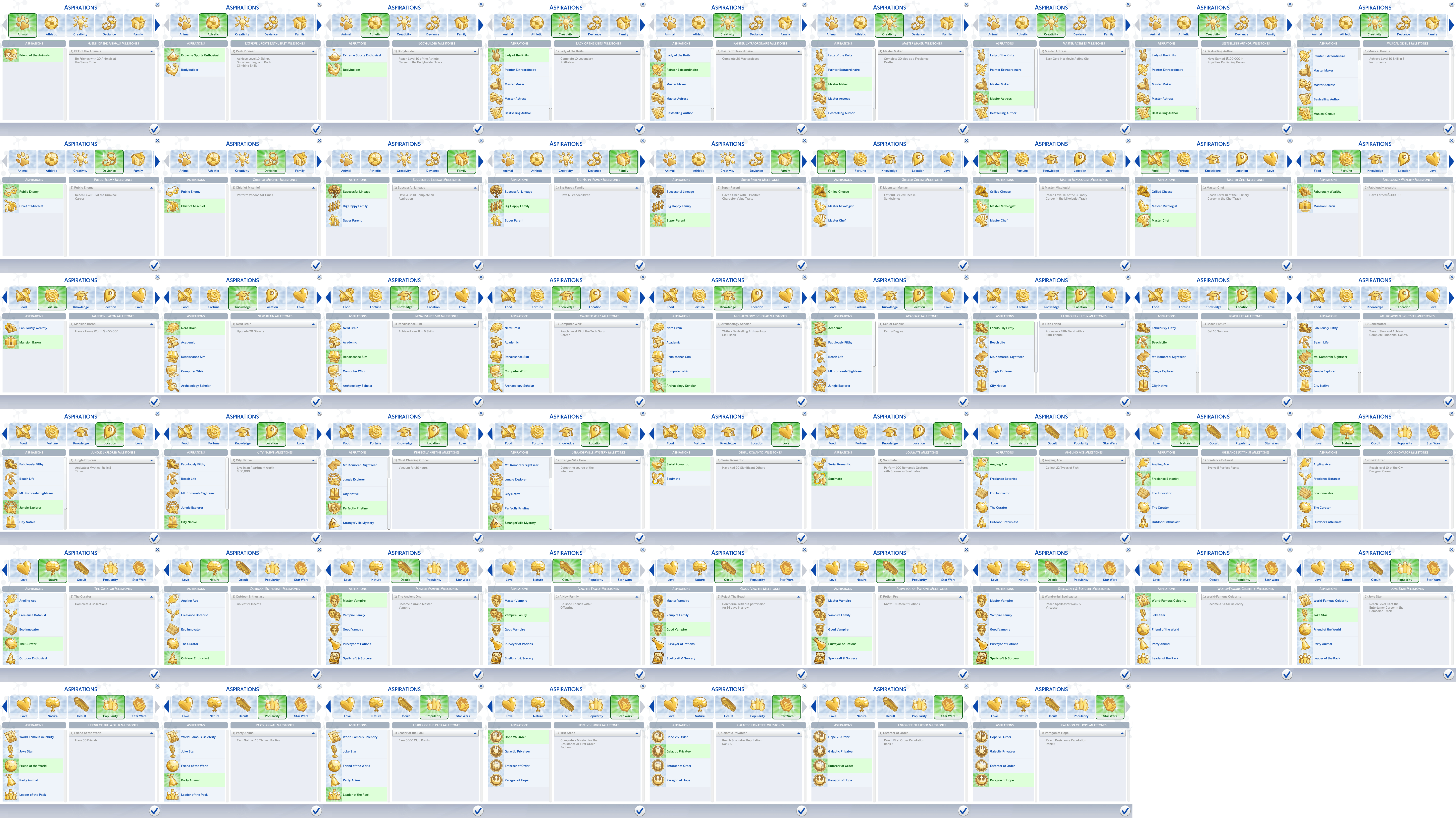 -I’ve done my best to set each Aspiration goal so that it will take til the late Adult/Elder life stage to complete in normal gameplay (aka not just spamming interactions), but I can’t really verify this without playing through every single one individually. Frankly, I don’t have the time to do this right now, so I will very likely be tweaking the goals based on feedback and as I gradually work through each one.