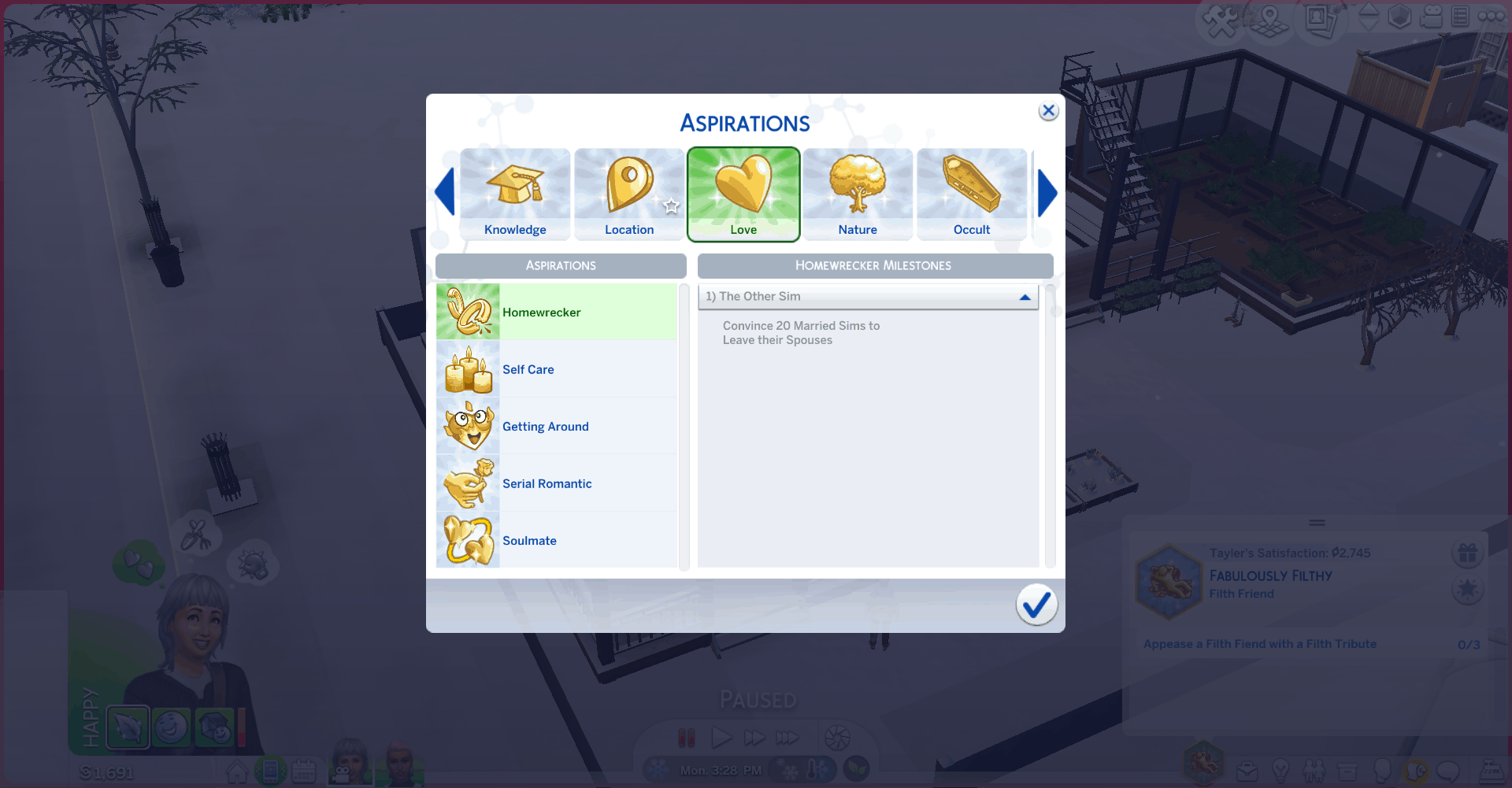 -Aspirations in the “Locations” category are worth 1000 Satisfaction Points, and those in the “Occult” category are worth 2000. Designed to take 1-2 in-game weeks respectively.