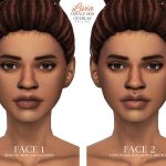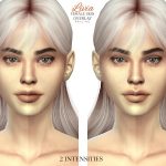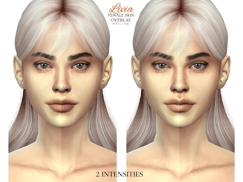 Skin overlay for female sims in 2 intensities, each with 2 different face options. The skin adapts to the original EA color.