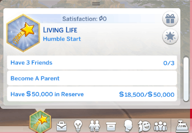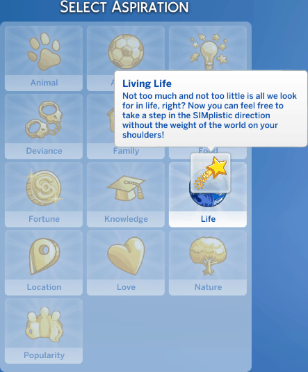 This is a simple custom aspiration that players can use towards challenges or whatever it wished upon. It has two milestones: Humble Start and Lived Life, and one custom Reward Trait: Life Liver.