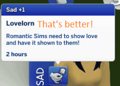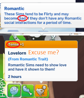 Am I the only one that was peeved off by the discrepancy between the Romantic trait’s description and what it actually does? I was promised a Sad moodlet when the Sim had gone too long without being romantic, not a Tense one! So, I fixed it. Now, it’s a Sad buff as god intended.