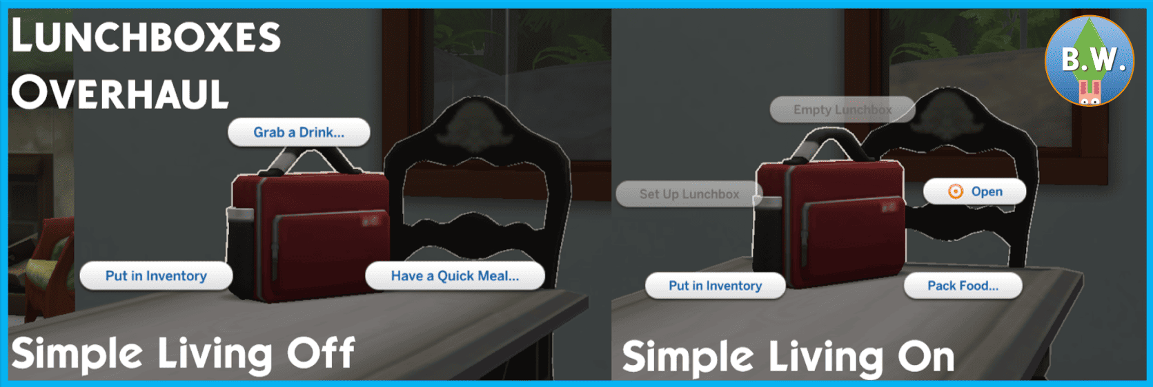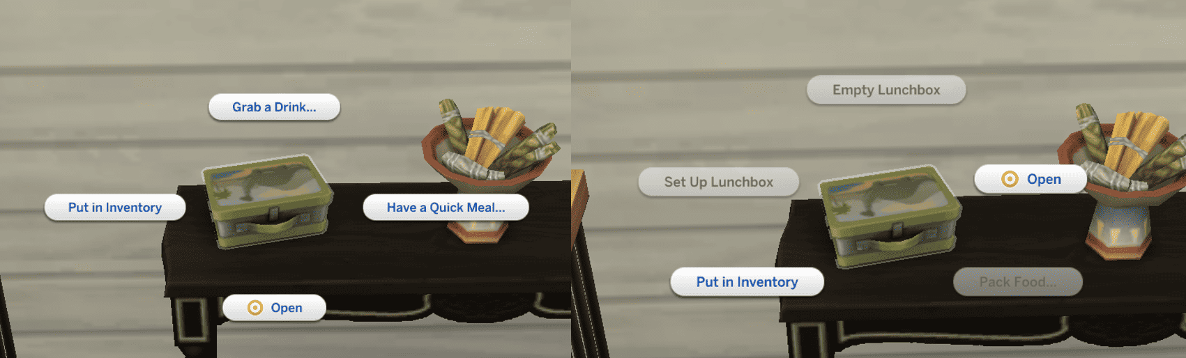– Now if you don’t play with the Simple Living lot challenge you’ll have the vanilla Maxis quick meals and quick drinks interactions, while if you have the challenge on, the lunchboxes will work as picnic baskets.