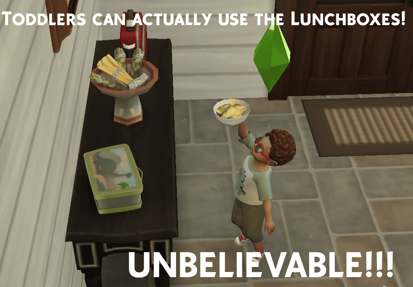 Anyway, back to the mod, this makes so that lunchboxes are actually BOXES where you store food inside of them, much like the picnic baskets from Cottage Living, and toddlers are also able to pick food other sims store in them.