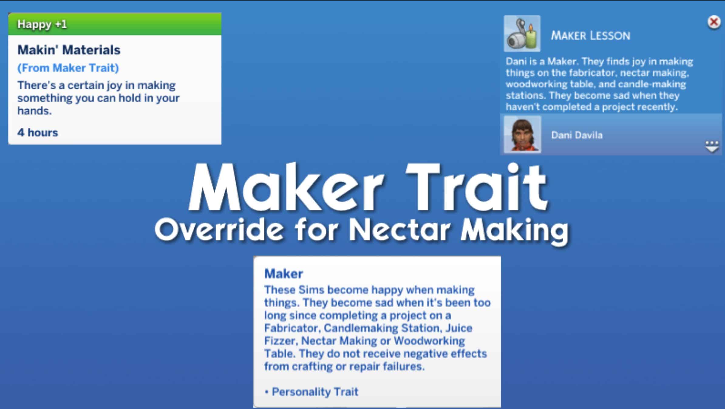 Our database contains only the highest quality Sims 4 mods that meet the most stringent requirements, like Maker Trait Override for Nectar Making Sims 4 Mod. This guarantees that our visitors have access to the most exclusive and useful files.